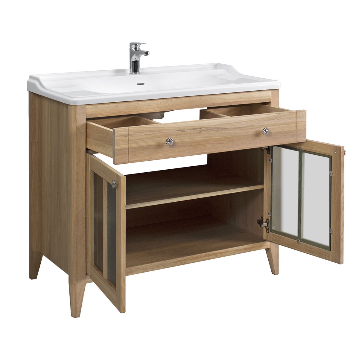 Тумба под умывальник Дуглас эргономична.Два вместительных ящика - прекрасное место для хранения всяческой гигиенической мелочи. Выдвижная система тумбы позволяет увидеть все содержимое. Рабочий механизм обладает долговечностью, бесшумностью и плавностью хода, благодаря качественным доводчикам Hettich.Такой вариант весьма удобен и позволяет использовать пространство максимально рационально.