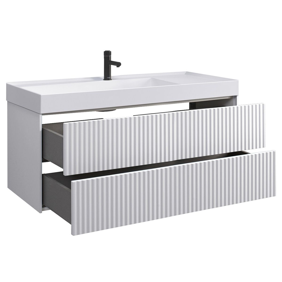 - Качество материалов: Мебель изготовлена из высококачественных водоотталкивающих материалов, что делает её идеальной для ванных комнат. Она устойчива к влаге и легка в уходе.