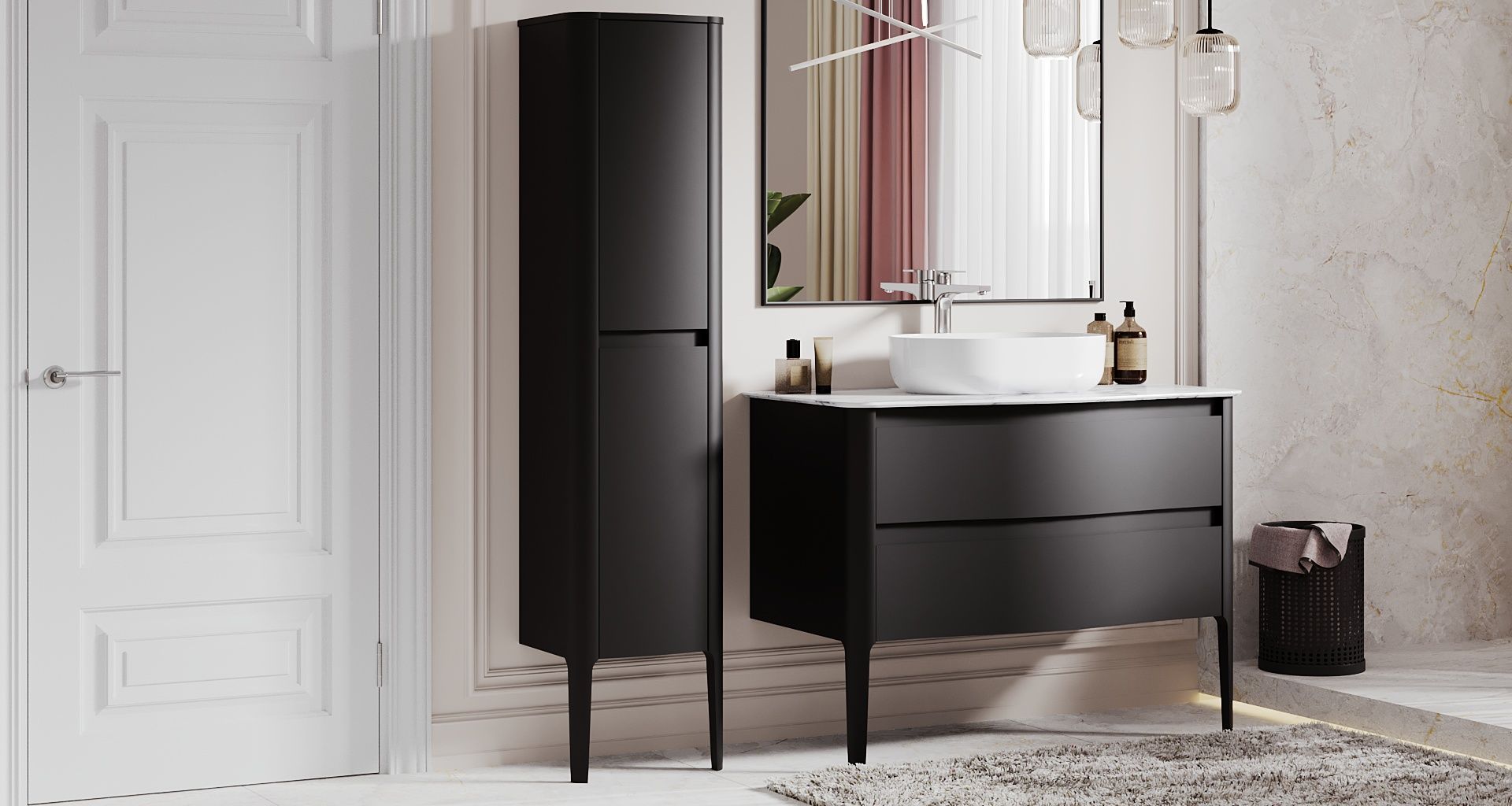 Гнутые фасады тумбы повторяют изгибы раковины Анжело. Это не только комфортно, но и нетривиально, а также удивительно красиво.
