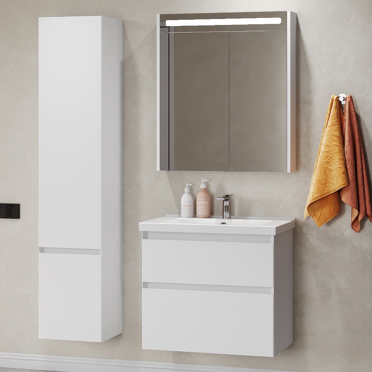 Ключевая особенность коллекции — фасады и боковины тумб скошены под углом 45 градусов. Такое решение придает мебели утонченный внешний вид и улучшает эргономику.