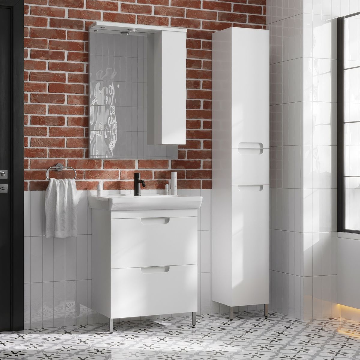 Изюминкой тумб Мадейра является возможность замены белой металлической вставки и ножек на черные матовые, что в сочетании со смесителями и прочими декоративными элементами черного матового цвета позволит создать интерьер в стиле лофт или индастриал.