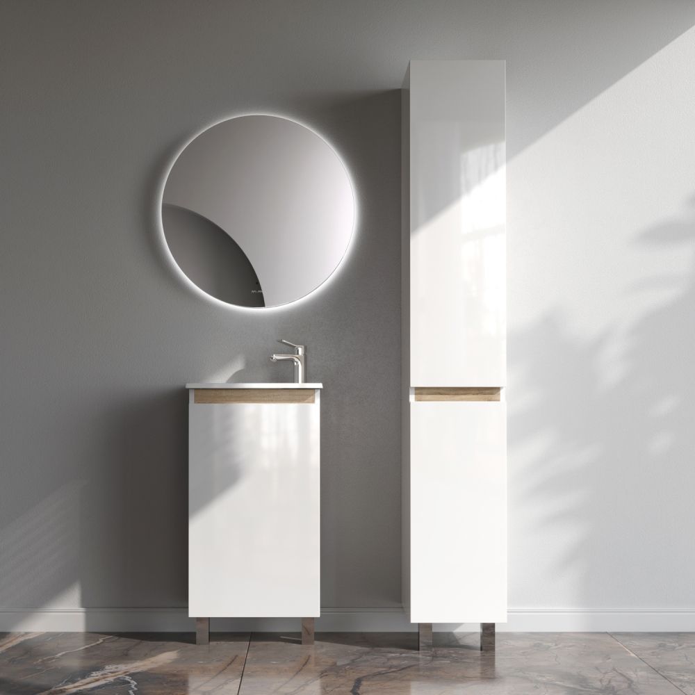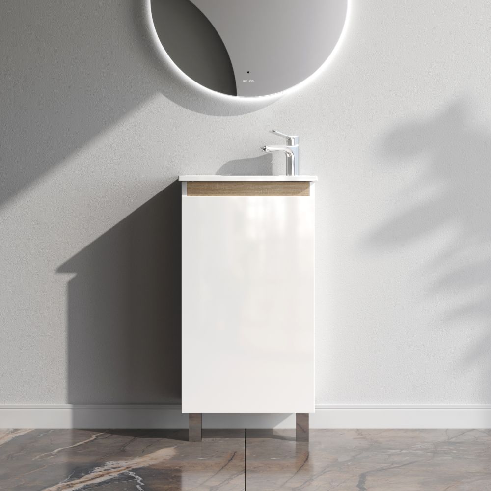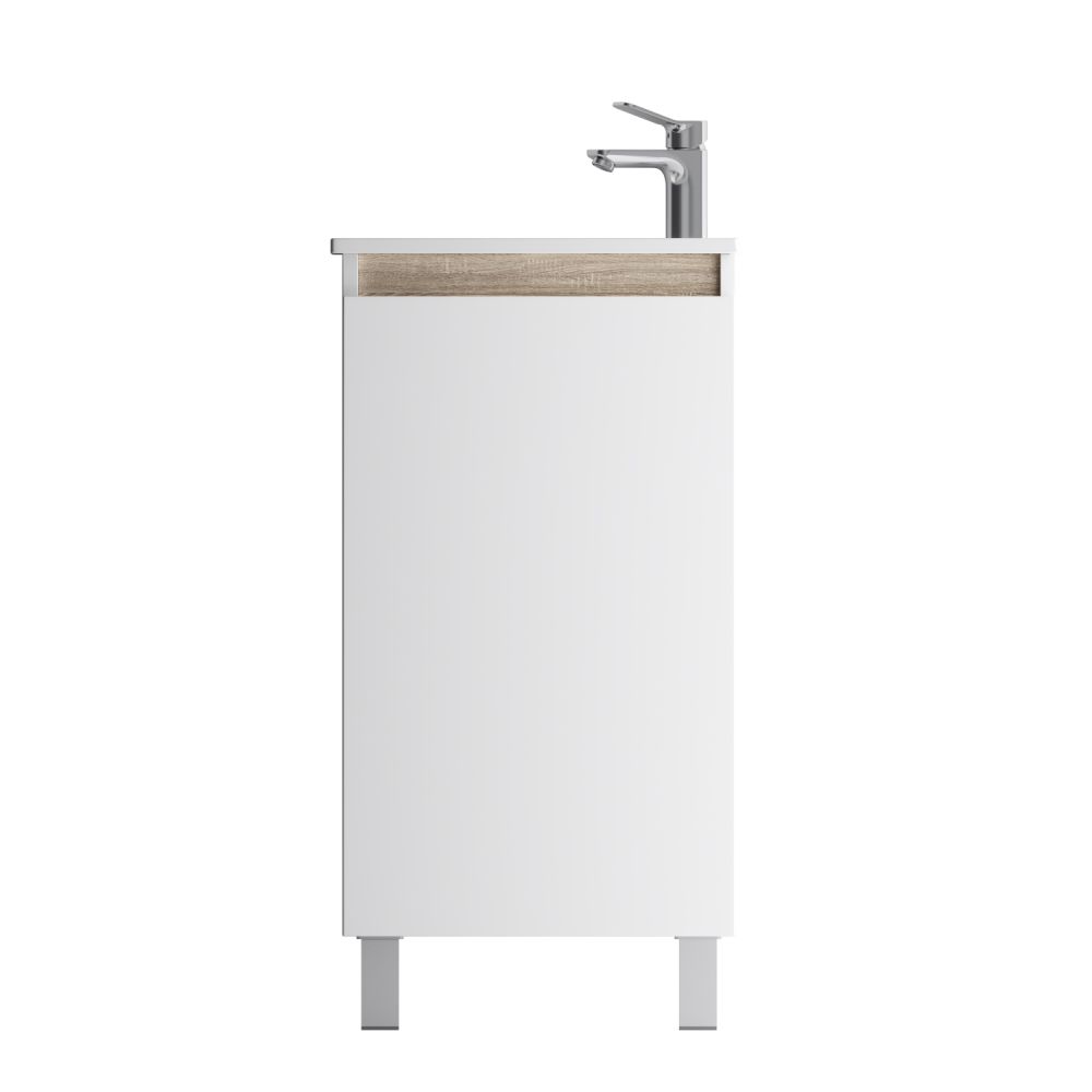 Встроенная керамическая раковина белоснежного цвета оснащена специальным бортиком для защиты от пролива воды за мебель.