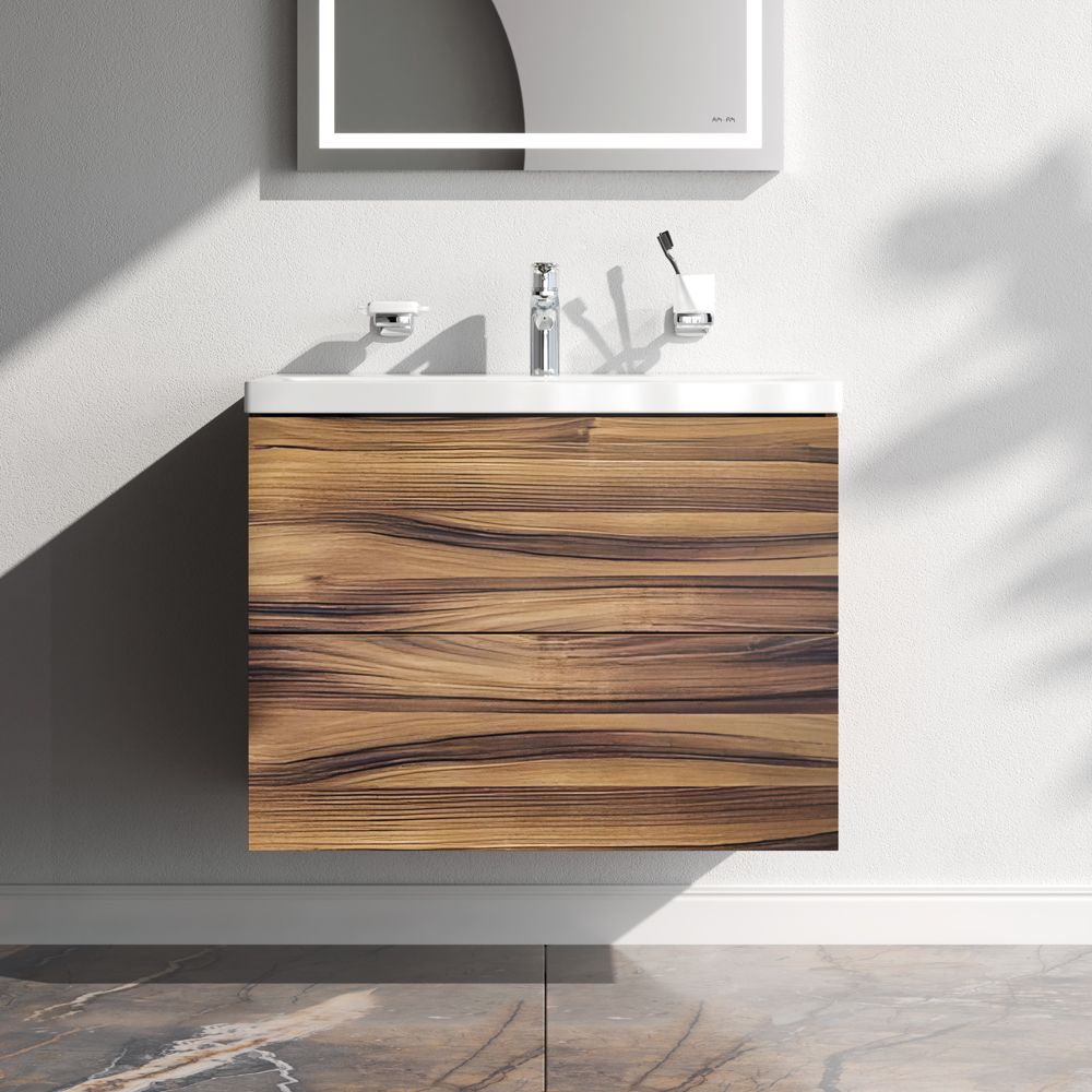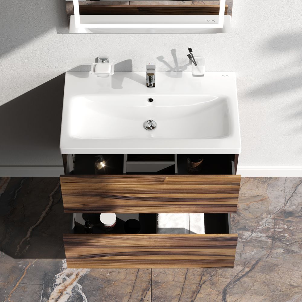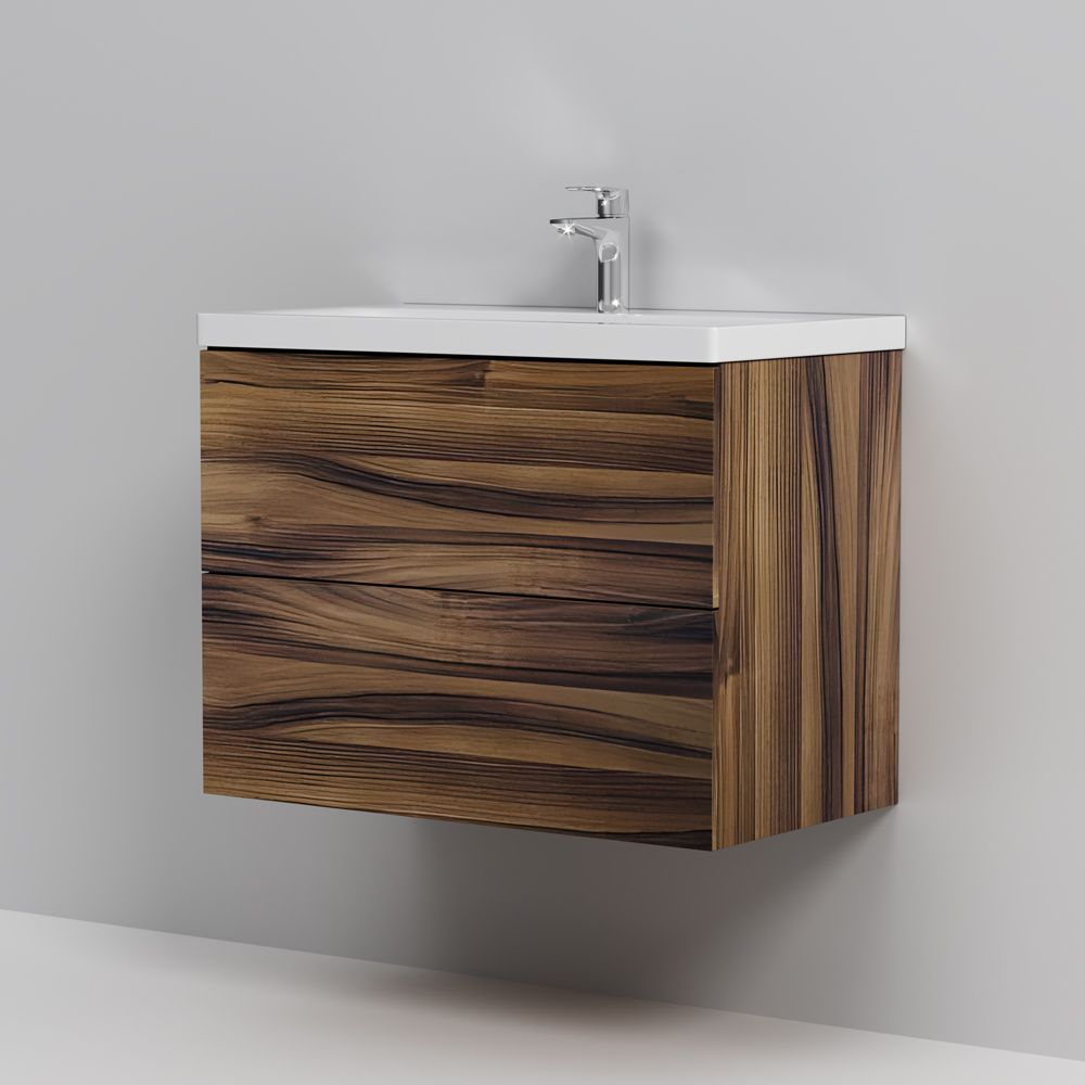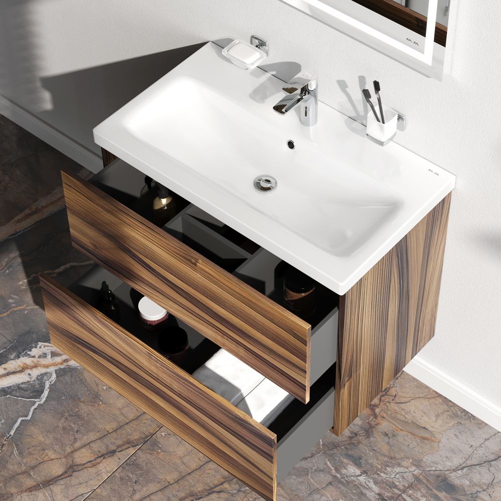 Представляем расширение цветовой палитры коллекции Gem в цвете “орех”. Подвесная база под раковину изготовлена из влагостойкого ЛДСП. Внутреннее пространство двух вместительных ящиков представлено в цвете антрацит с антискользящим эффектом.