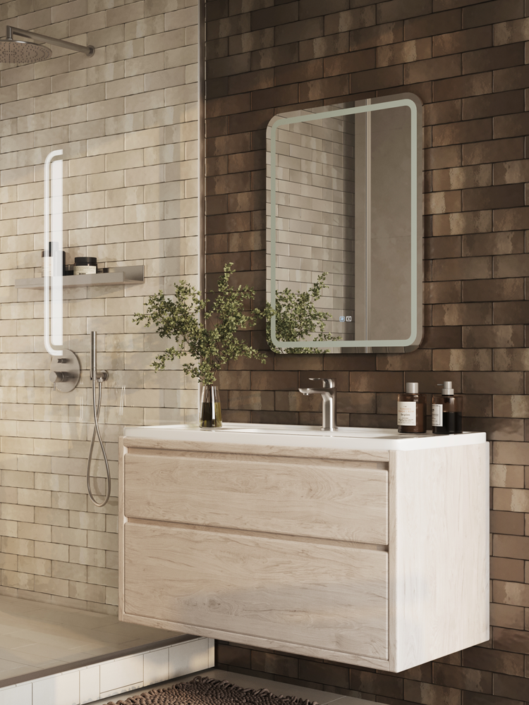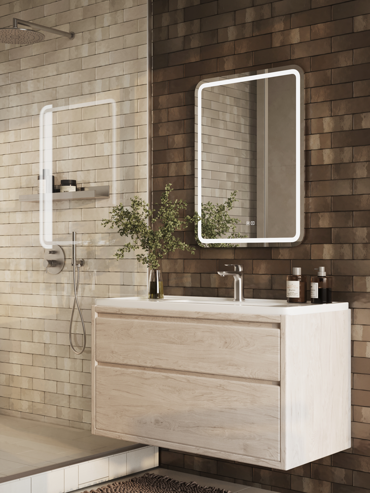 - Зеркала и зеркальные шкафы: модели со встроенным LED-освещением, которые украшают пространство и делают косметические процедуры более комфортными.