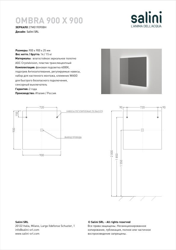 В основе каждого зеркала Salini – влагостойкое просветленное зеркальное полотно нового поколения MNGE CRYSTALVISION ОТ AGC - это современный интерьерный продукт с показателями максимальной нейтральности и отсутствием каких-либо оттенков, аналогов которому на рынке не представлено. Благодаря своей кристальной чистоте зеркало передаёт изображение без искажений и дополнительных оттенков. Не имеющее в своём составе меди и формальдегидов. Именно оно обеспечивает высокий уровень цветопередачи отражения с показателем CRI = 100%.