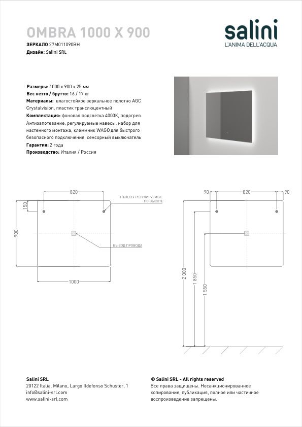 - Комплектация: Зеркало, клемма WAGO, | фоновая подсветка 4000К, блок питания, сенсорный включатель, комплект крепления, функция обогрев - антизапотевание, регулируемые навесы