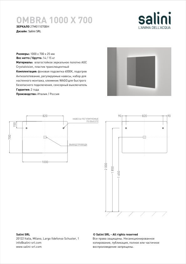 - Комплектация: Зеркало, клемма WAGO, | фоновая подсветка 4000К, блок питания, сенсорный включатель, комплект крепления, функция обогрев - антизапотевание, регулируемые навесы