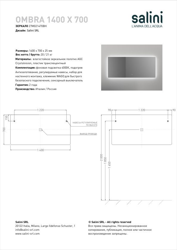 - Комплектация: Зеркало, клемма WAGO, | фоновая подсветка 4000К, блок питания, сенсорный включатель, комплект крепления, функция обогрев - антизапотевание, регулируемые навесы