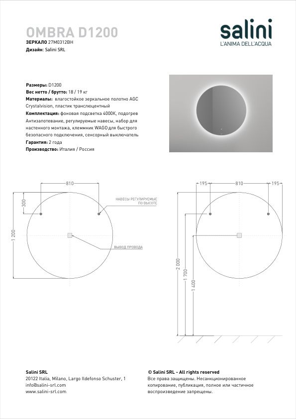 Зеркало, клемма WAGO, фоновая подсветка 4000К, блок питания, сенсорный включатель, комплект крепления, функция обогрев - антизапотевание, регулируемые навесы |
