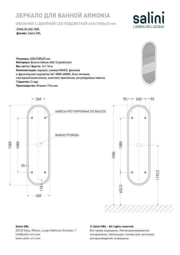 - Комплектация: Зеркало, клемма WAGO, | фоновая и фронтальная подсветка 3в1 3000-6000К блок питания, сенсорный включатель, комплект крепления, регулируемые навесы