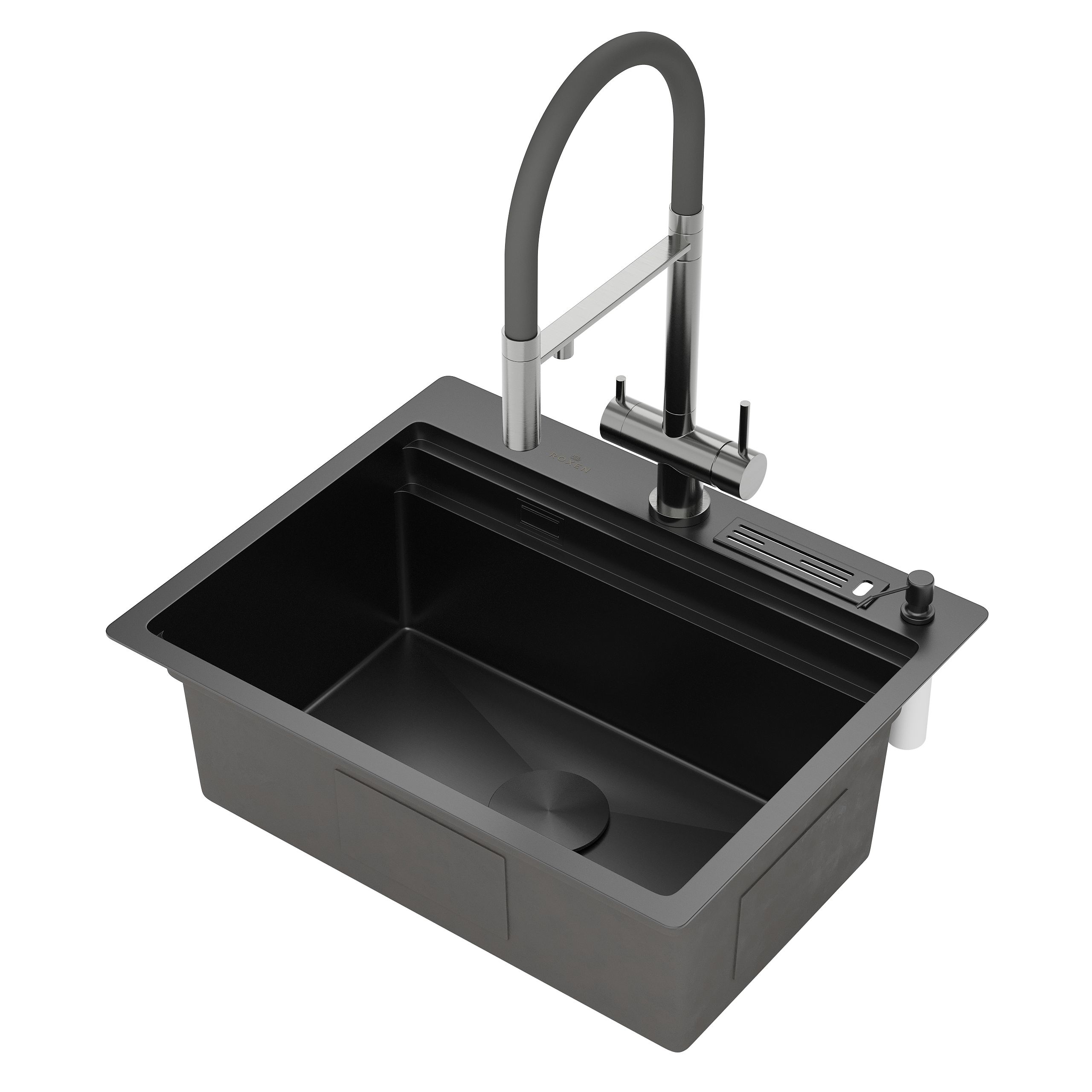 - стальная мойка; - сифон; - корзинчатый вентиль; - декоративная накладка; - держатель для ночей; - коландер из нержавеющей стали; - коландер телескопический; - дозатор для моющих средств; - разделочная доска; - 2 заглушки на отверстия; - комплект креплений к столешнице. |