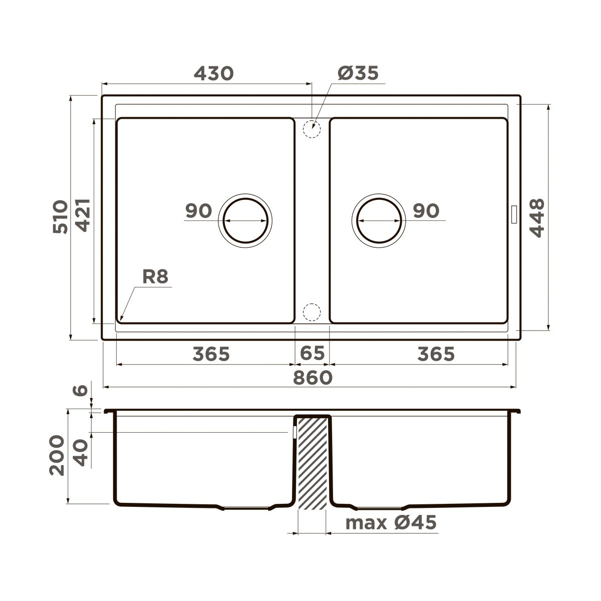 • Материал выдерживает высокие температуры до 280°С (но не стоит ставить на поверхность мойки горячие сковородки и кастрюли, т.к их температура может достигать 500°С);