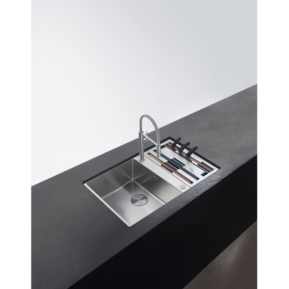Функциональный рабочий центр для кухни, объединяющий удобство мойки и практичность продуманного набора аксессуаров. Оснащена двумя чашами и системой вентиль-автомат Easy-Click, обеспечивающей комфортное управление сливом.