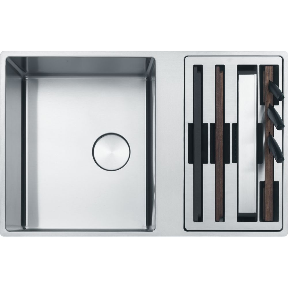 Вентиль-автомат и сифон , кнопка Easy Click в отделке нерж.сталь, круглая декоративная крышка для слива в большой чаше (В наборе разделочные доски (пластиковая и деревянная), миска из нержавеющей стали, 3 ножа (специально для хлеба, овощей, мяса/рыбы, деревянный держатель для ножей) |
