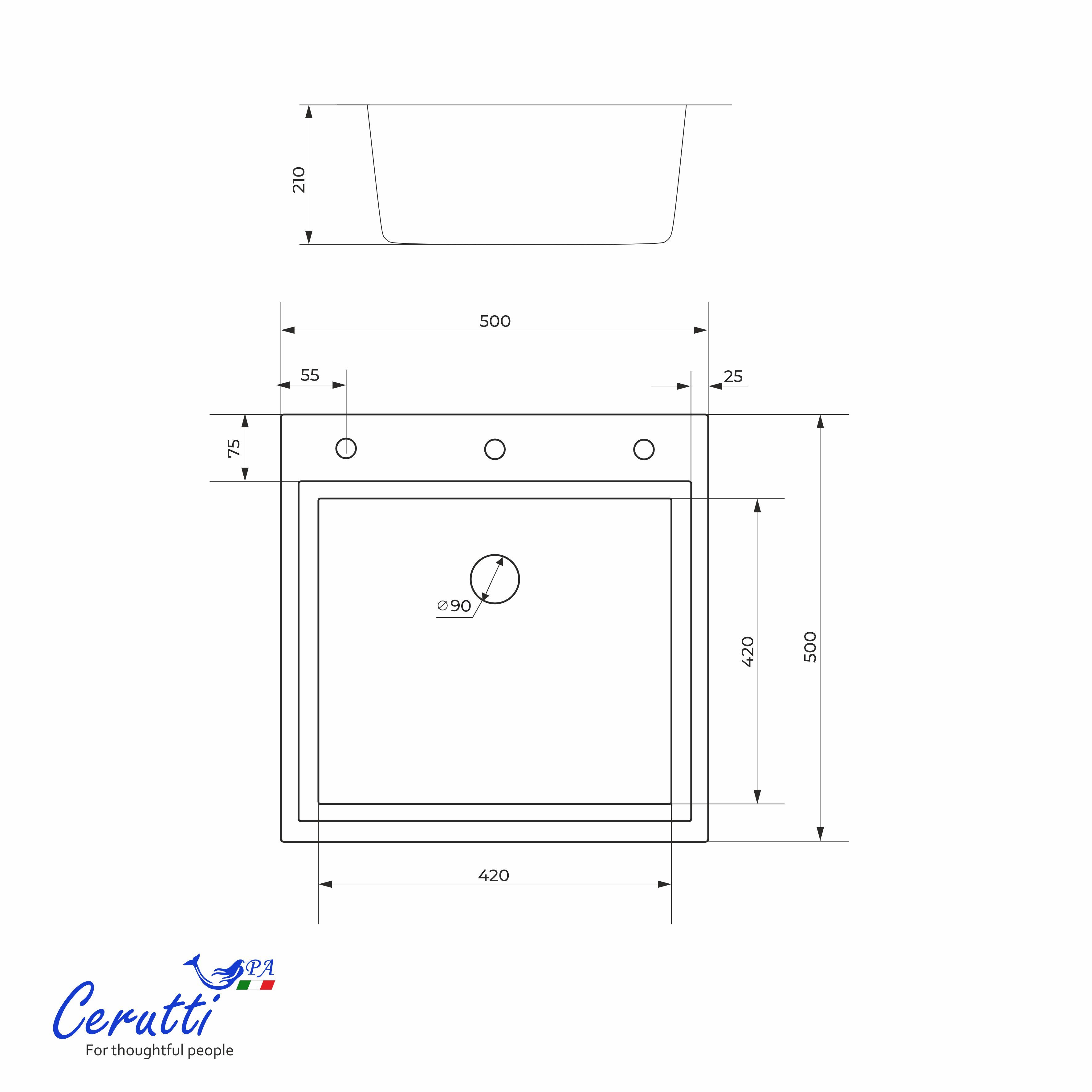 Размер раковины: 500х500мм. Устанавливается на отверстие в столешнице, размерами от 400х400 до 450х450мм.