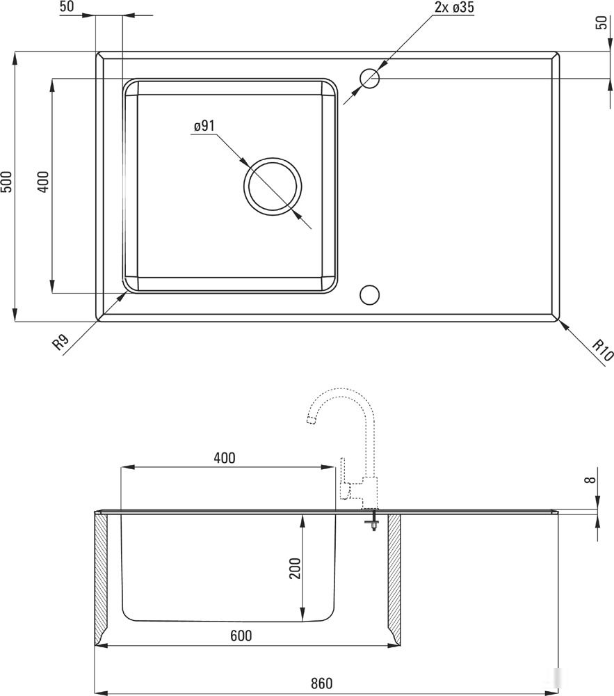 Свойства. Тип: мойка кухонная; Материал: нержавеющая сталь; Способ установки: врезная на столешницу; Форма мойки: прямоугольная; Количество чаш: 1; Коллекция: Pallas (Deante); Цвет: белый, нержавеющая сталь, хром, фотопечать; Рисунок: геометрический; Название расцветки: геометрия; Поверхность: сатин; Крыло: есть; Расположение основной чаши: оборачиваемая; Перелив: в основной чаше; Отделка: закаленное стекло (край - трапеция); Отверстие для смесителя: есть (2); Диаметр сливного отверстия: 3.5"; Мин. ширина шкафа: 60 см; Cифон в комплекте: есть; Комплект поставки: клапан-автомат, сифон, отвод для посудомоечной/стиральной машины, мойка; Длина/диаметр мойки: 86 см; Ширина мойки: 50 см; Длина/диаметр чаши: 40 см; Ширина чаши: 40 см; Глубина чаши: 20 см.