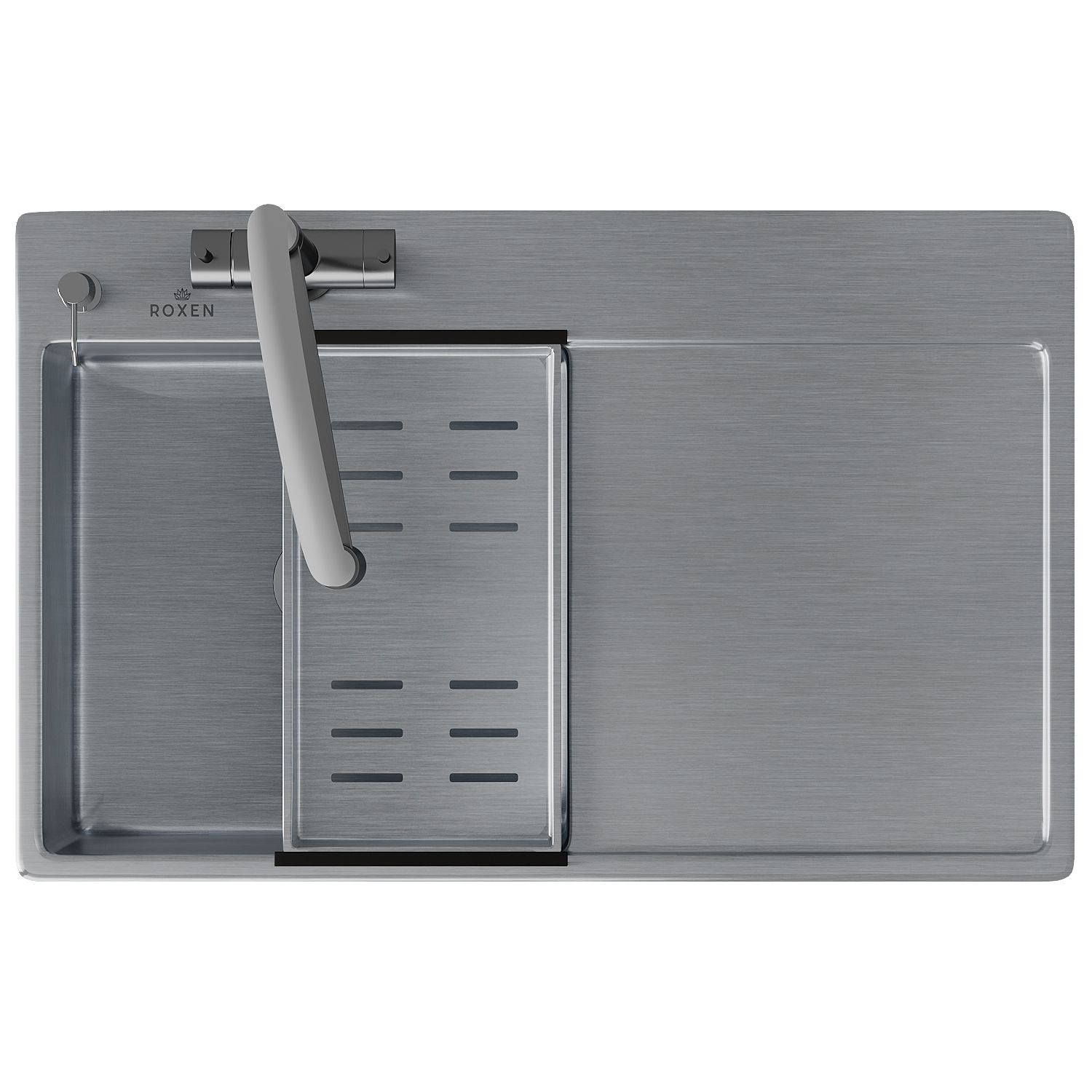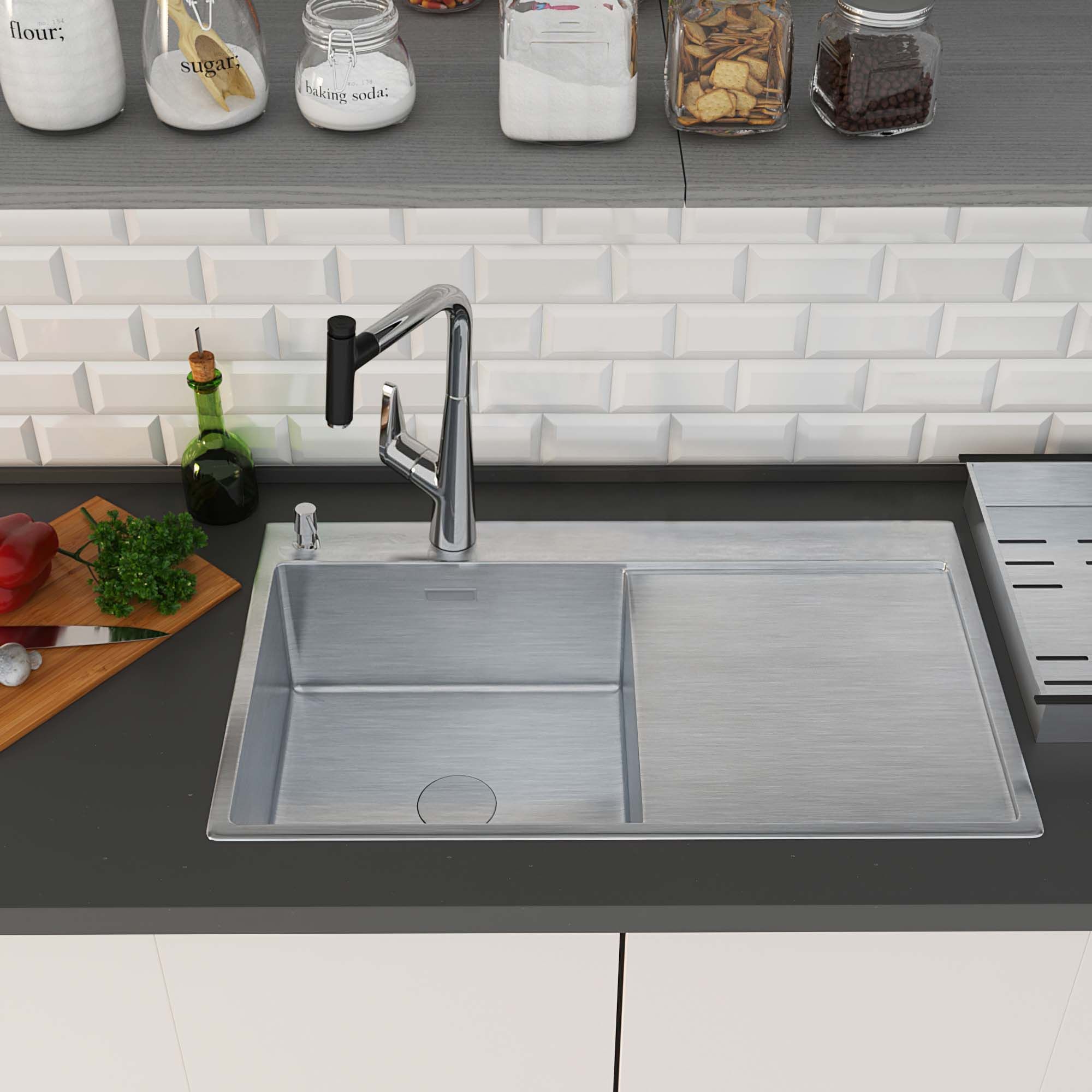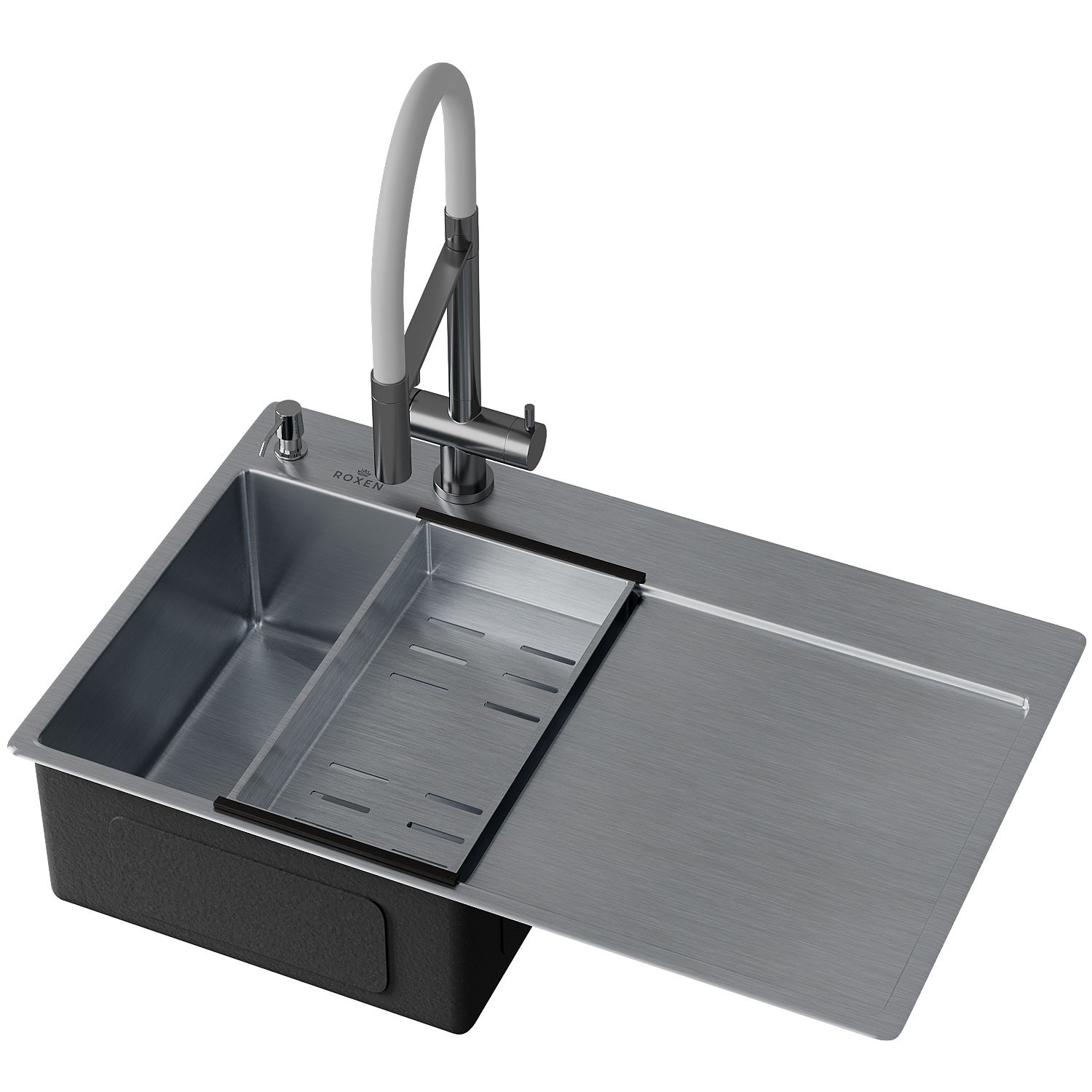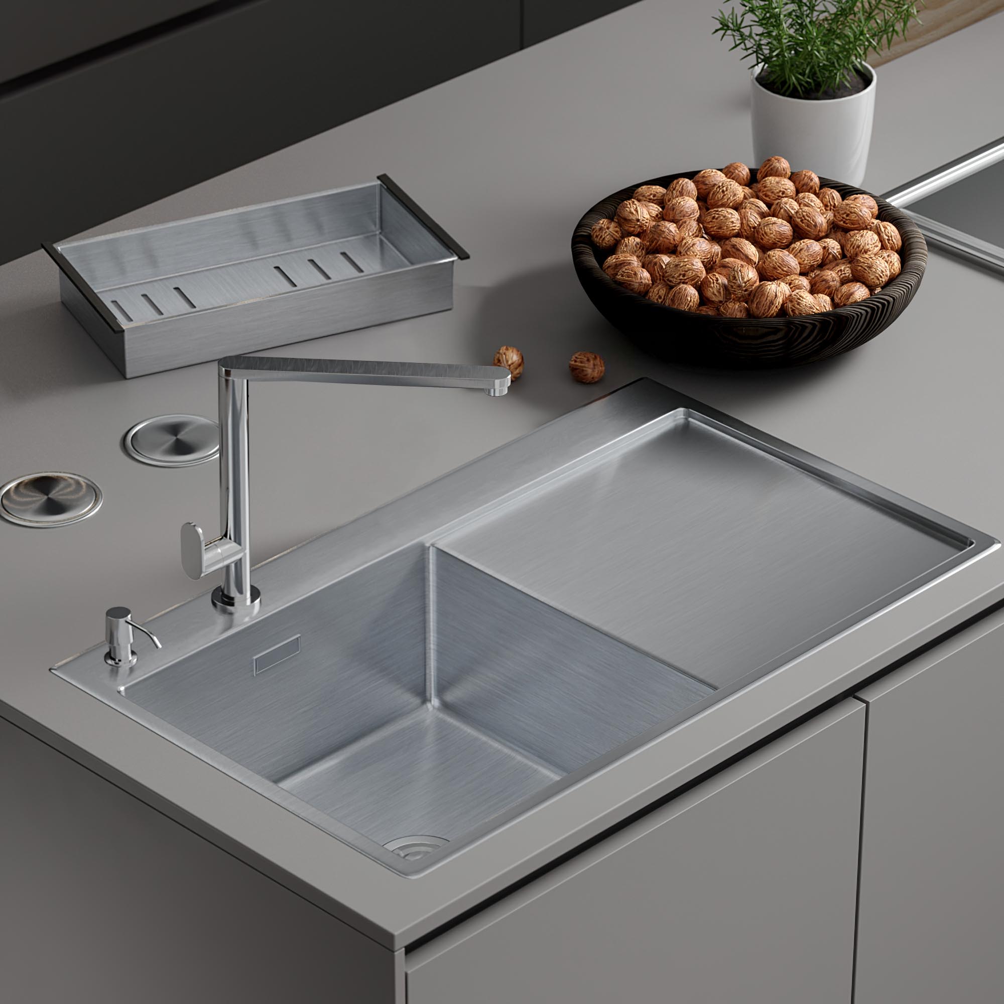 - стальная мойка; - сифон; - коландер из нержавеющей стали; - дозатор для моющих средств; - корзинчатый вентиль; - 2 заглушки на отверстия; - комплект креплений к столешнице. |
