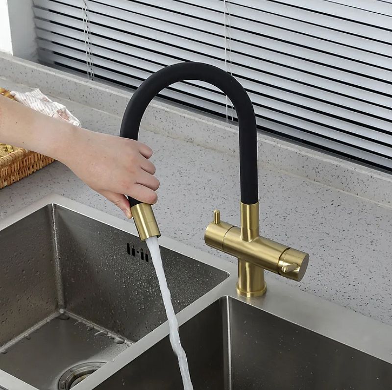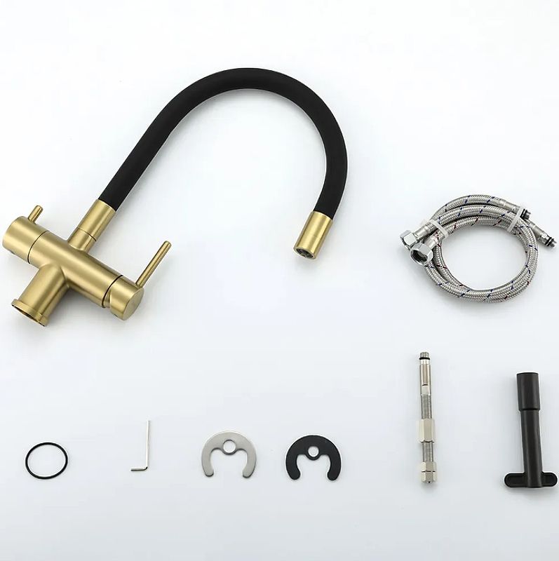 Смеситель доступен в двух цветах - золотой сатин и черный, что позволяет подобрать его под интерьер вашей кухни. Изготовлен из высококачественной латуни, он обеспечивает долгий срок службы и устойчив к коррозии.