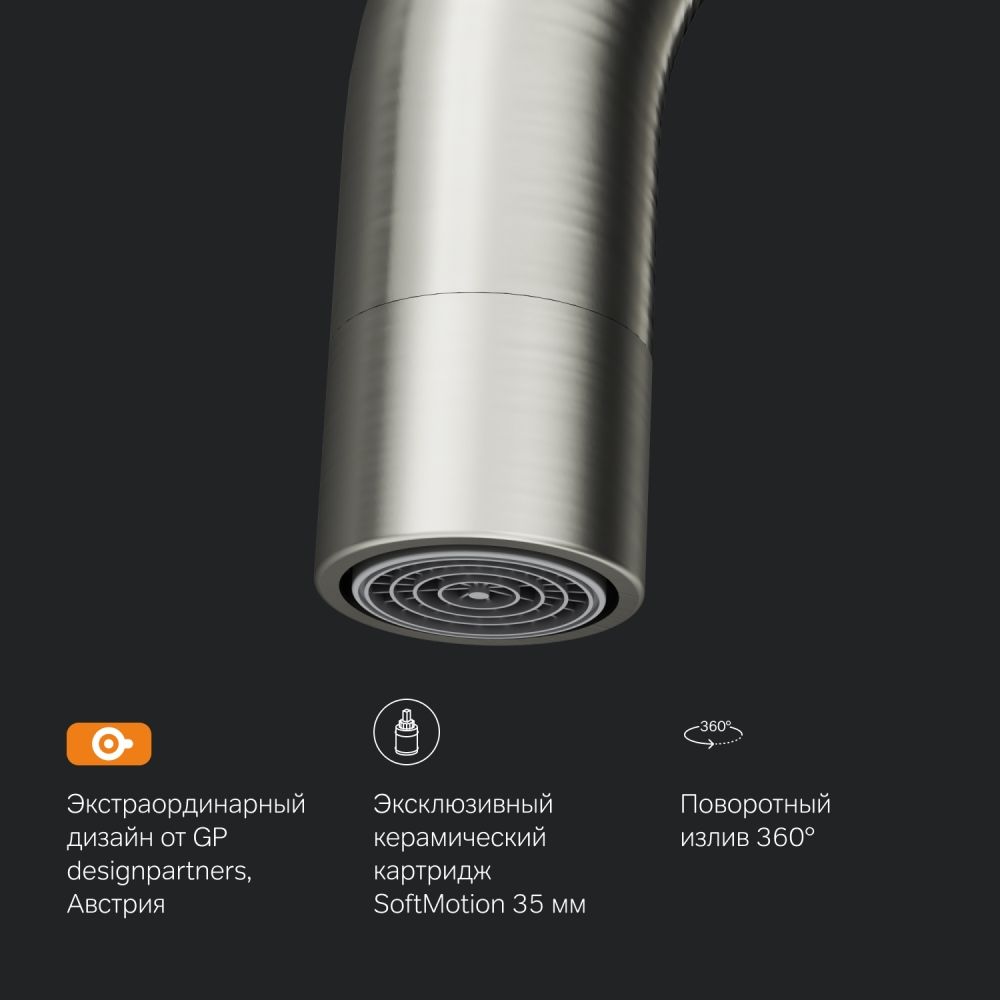 Максимальный комфорт: плавное вращение излива обеспечивает непревзойденное удовольствие от использования и удобство в работе на кухне.