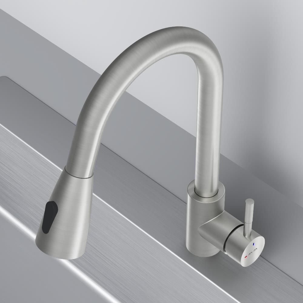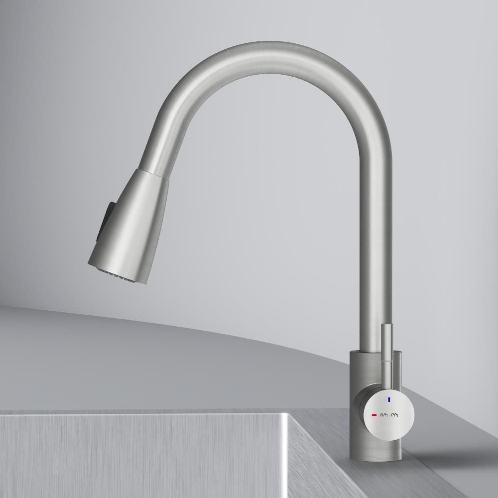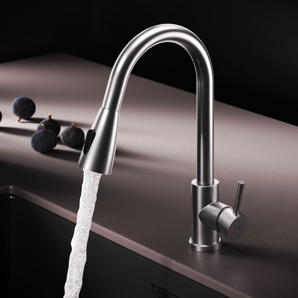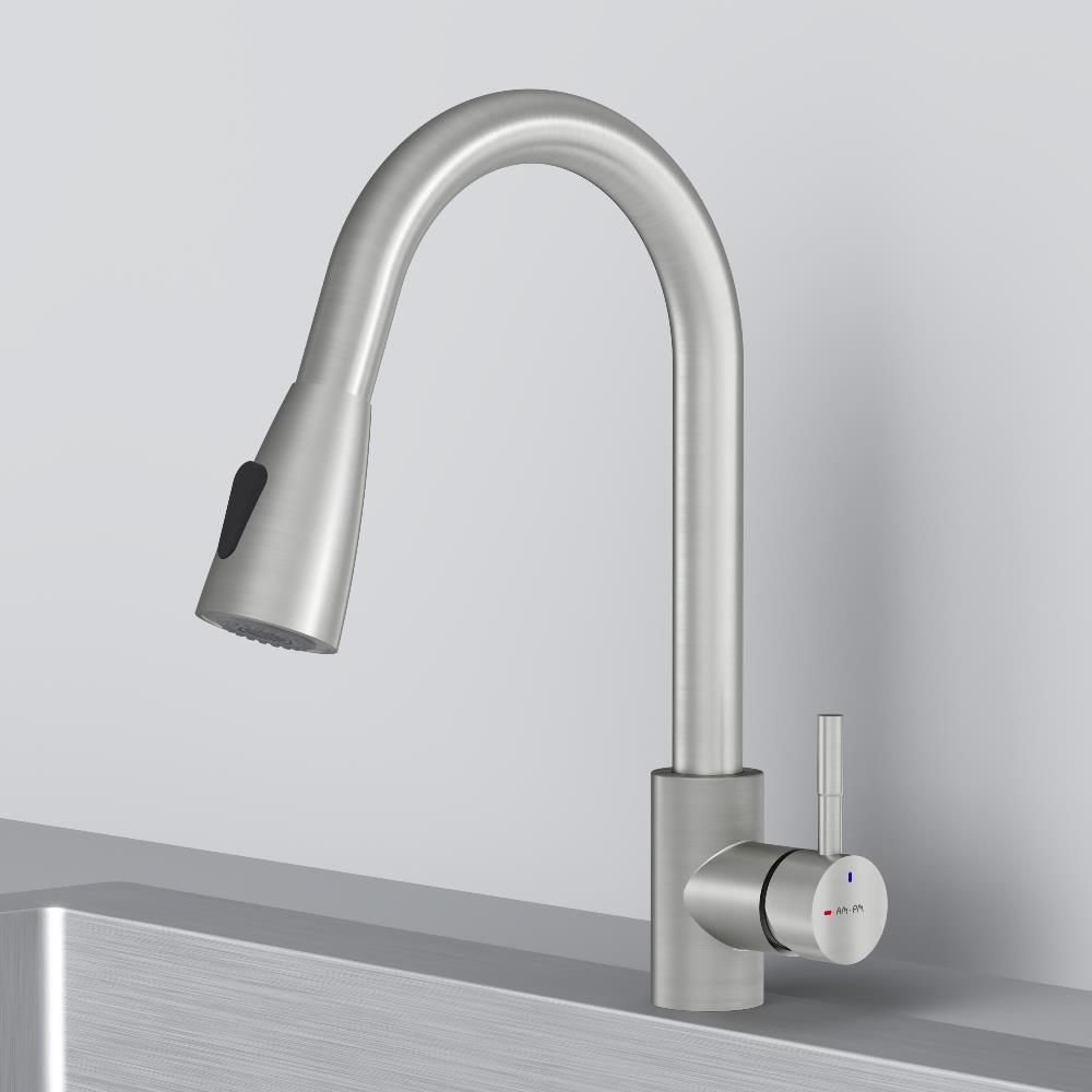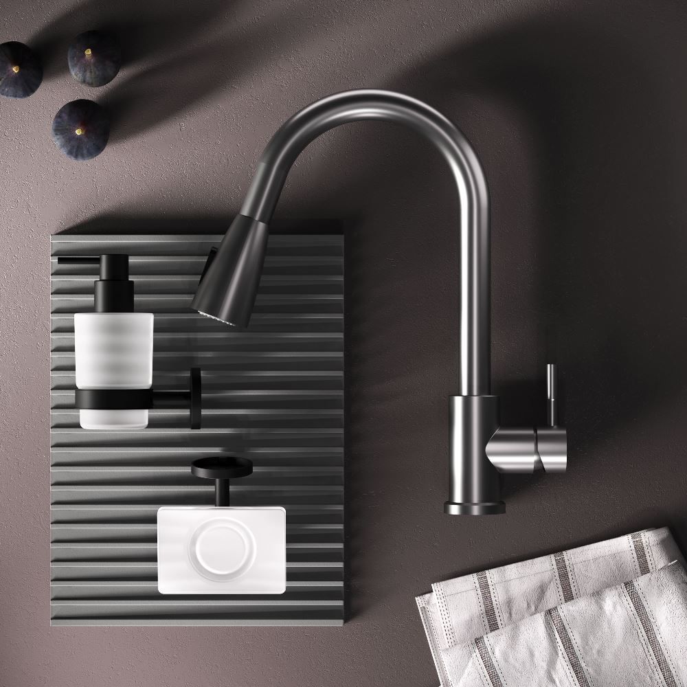 Смеситель оборудован вытяжным гибким изливом который позволит с легкостью справится с такими задачами как мытье раковины наполнение больших емкостей и мытье овощей и фруктов. В зависимости от задачи вы можете легко переключаться между обычным потоком воды и режимом «душ».