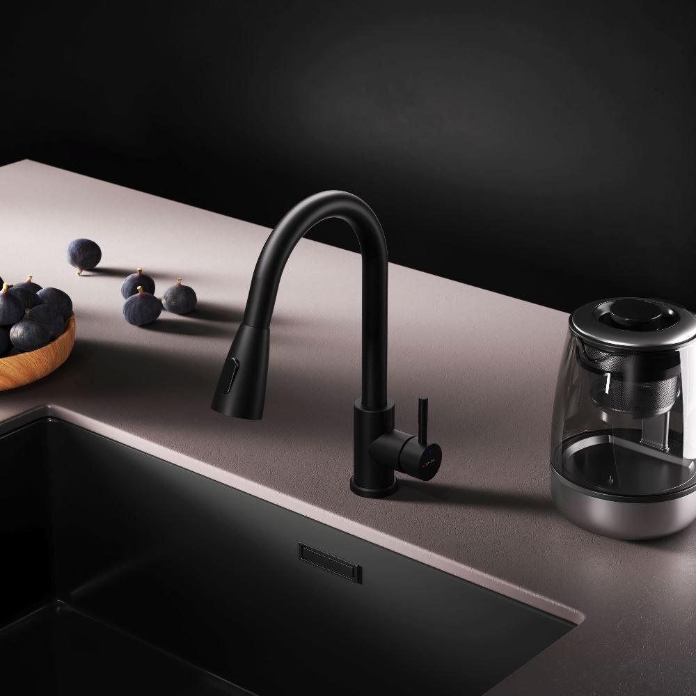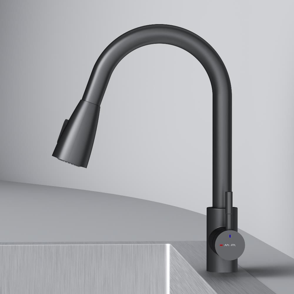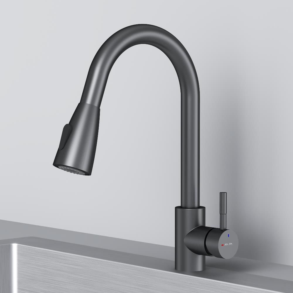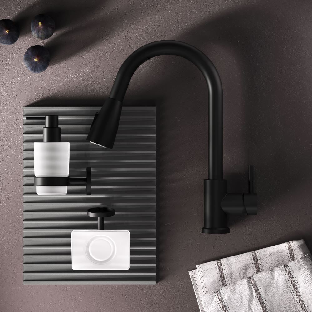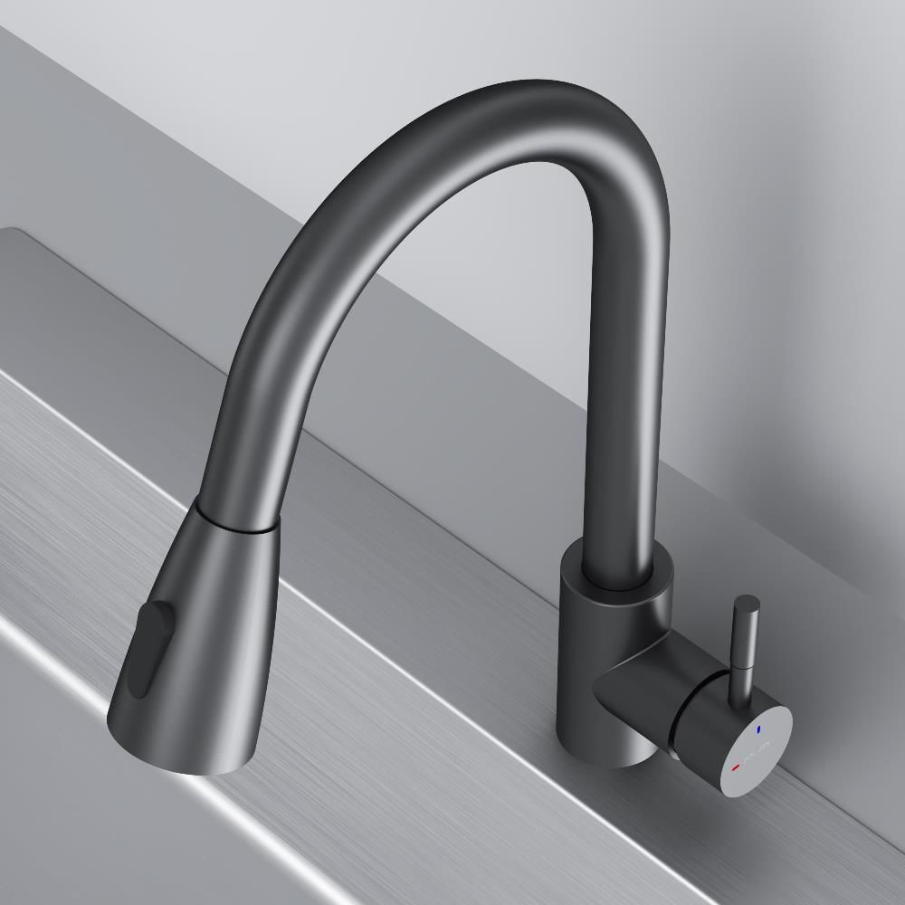 Смеситель оборудован вытяжным гибким изливом который позволит с легкостью справится с такими задачами как мытье раковины наполнение больших емкостей и мытье овощей и фруктов. В зависимости от задачи вы можете легко переключаться между обычным потоком воды и режимом «душ».