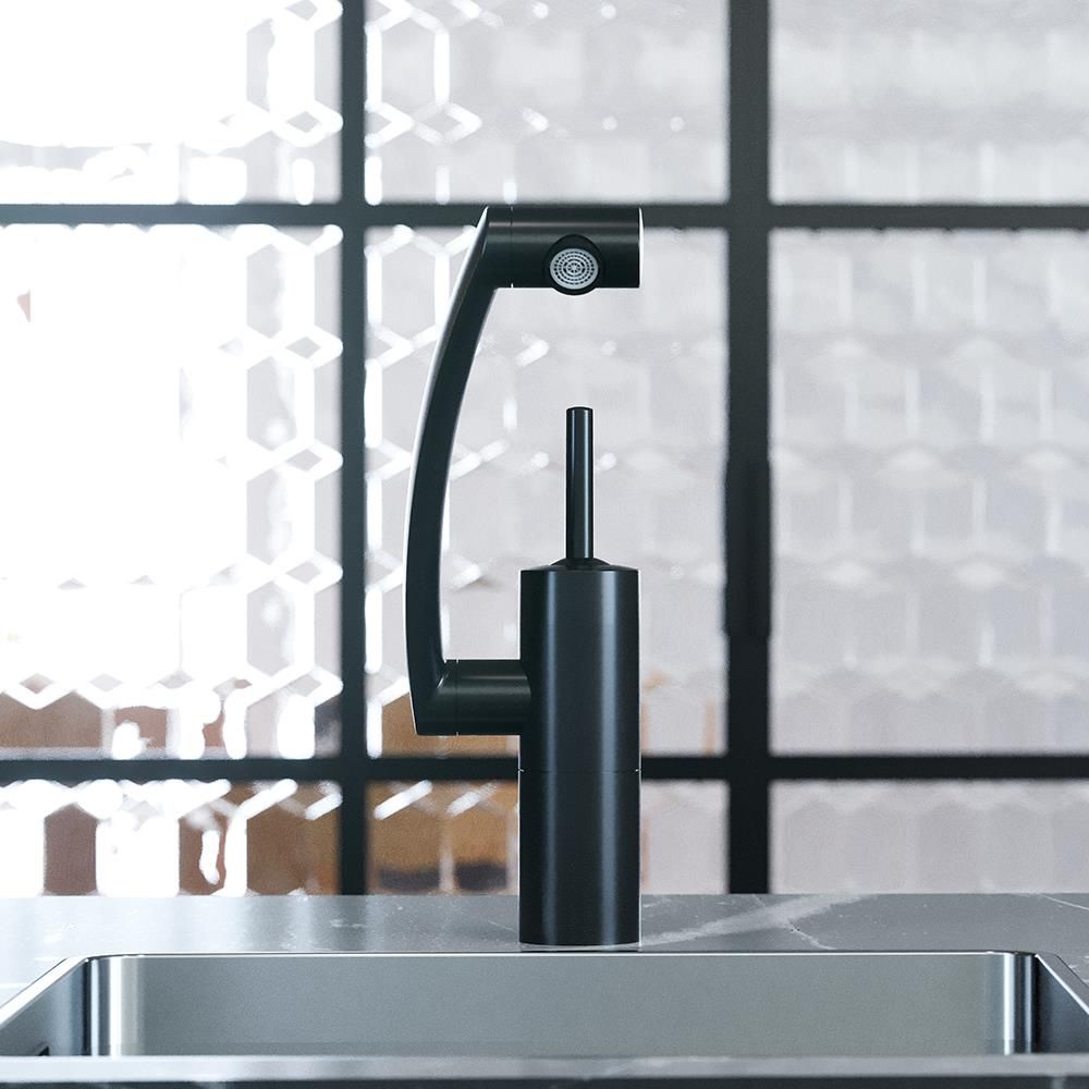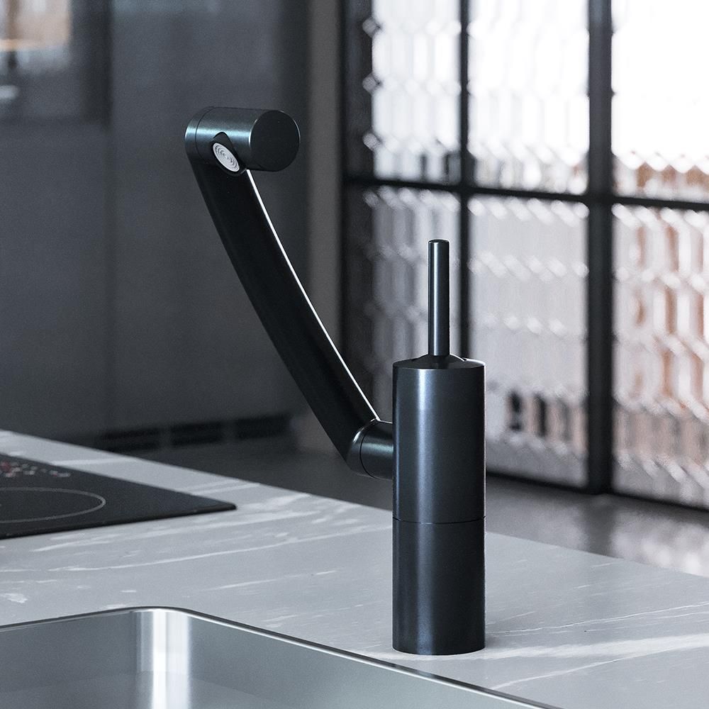 Глубокий матовый цвет дополнен покрытием High Gloss которое уберегает поверхность смесителя от мелких повреждений. Невероятная синергия! Вращение излива вокруг своей оси в совокупности с подвижным аэратором и регулировкой высоты — это дает смесителю Arc право называться самым функциональным смесителем своего класса — ведь вы с легкостью можете направить поток воды в любое место раковины а также даже помыть столешницу и место за мойкой. Смеситель Arc это настоящая свобода на кухне. ""