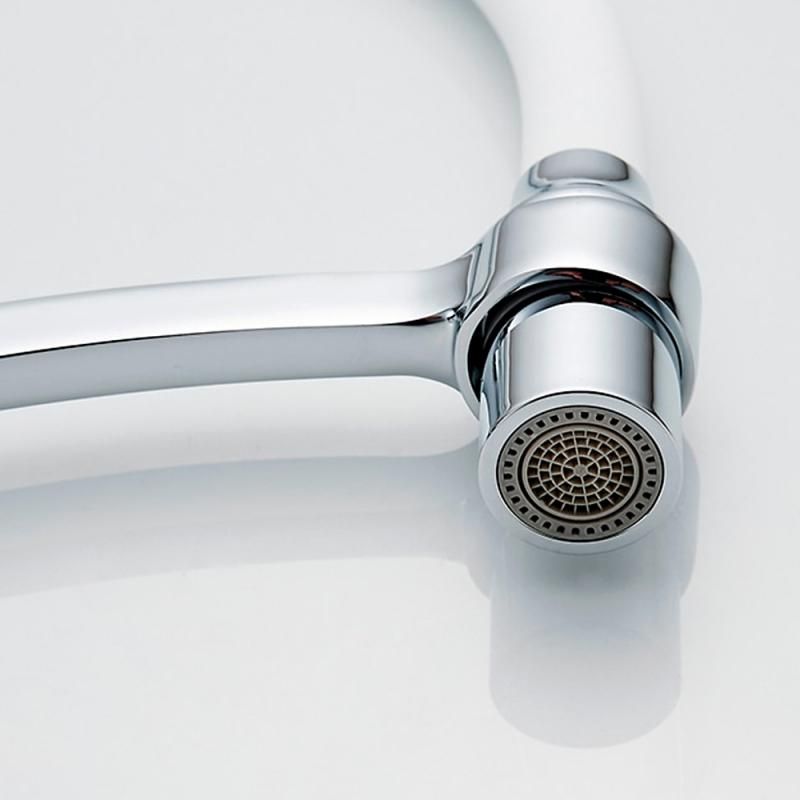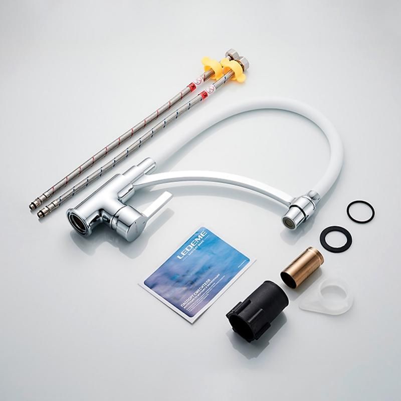 Свойства. Артикул: L4499-3; Гарантийный срок: 1 год; Назначение: Для кухни; Управление: Однорычажные; Форма смесителя: Округлые; Стиль: Современные; Цвет: Хром, Белый/хром, Белые; Высота излива: Высокий; Функции излива: С гибким изливом, Поворотный; Размер излива: Средний; Способ монтажа: На одно отверстие, На гайке; Тип подводки: Гибкая подводка; Система быстрого монтажа: Нет; Присоединительный размер: 1/2; Особенности: С аэратором; Материал: Латунь; В комплекте: Гибкая подводка 1/2.
