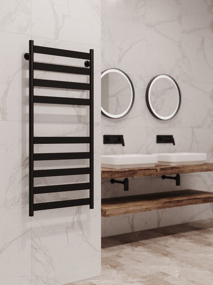 Полотенцесушитель водяной Stinox Napoli 500x1200, нижнее подключение, черный матовый, 1/2" ВР (внутренняя резьба), 9 перекладин
