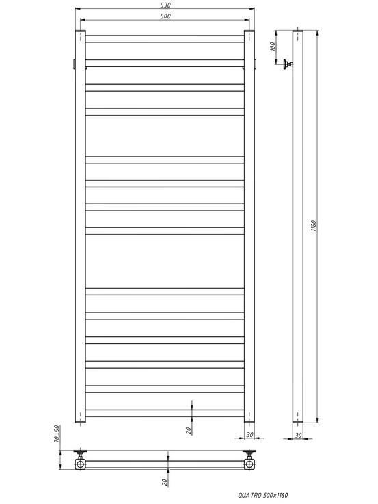 Свойства. Бренд: Stinox; Вес в упаковке, г: 10600; Межосевое расстояние, мм: 500; Вариант подключения: Нижнее; Длина, мм: 70; Ширина, мм: 530; Высота, мм: 1160; Название цвета: Черный матовый; Тип: Полотенцесушитель; Площадь обогрева, кв.м: 6.4; Гарантия: 10 лет; Наличие полок: Нет; Материал: Нержавеющая сталь; Вид полотенцесушителя: Водяной; Форма полотенцесушителя: Лесенка; Теплоотдача, Вт/ч: 637; Количество монтажных отверстий: 2; Серия: Quatro; Страна-изготовитель: Беларусь; Диаметр трубы (стойка/перекладина): 30*30/20*20; Группировка ребер: 6-6; Базовая комплектация: кран Маевского 2 шт.,крепление - 2 шт., паспорт; Диаметр подключения: 1/2" ВР (внутренняя резьба).
