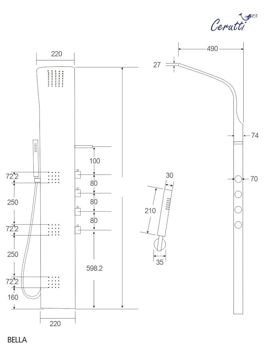 Комплектация: душевая панель, душевая лейка, смеситель, шланг для душа, верхний душ, крепеж, инструкция