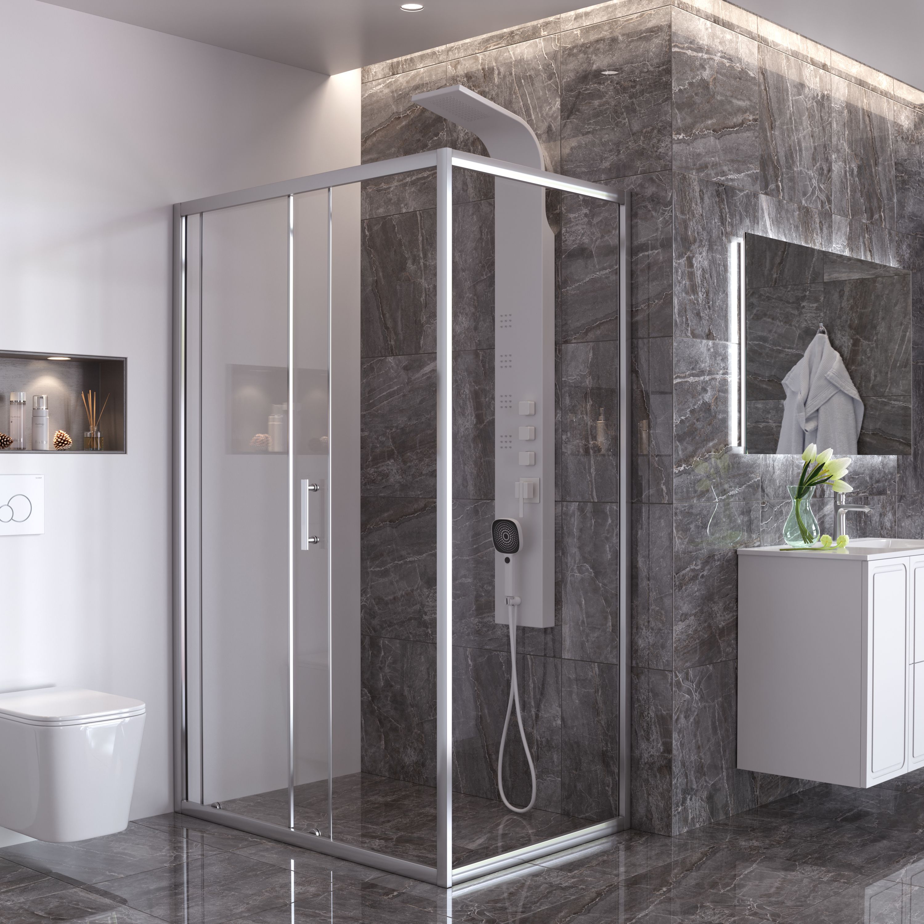 В ассортименте — душевые кабины и уголки, ванны, унитазы, раковины, смесители, мебель и аксессуары для ванных комнат. Изделия отличаются минималистичным дизайном и представлены в разных цветовых решениях (хром, чёрный матовый, белый и др.).