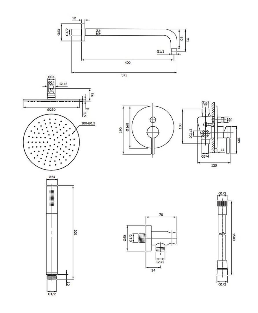 - верхний душ латунный (WG125CR), размер: ø25 см;