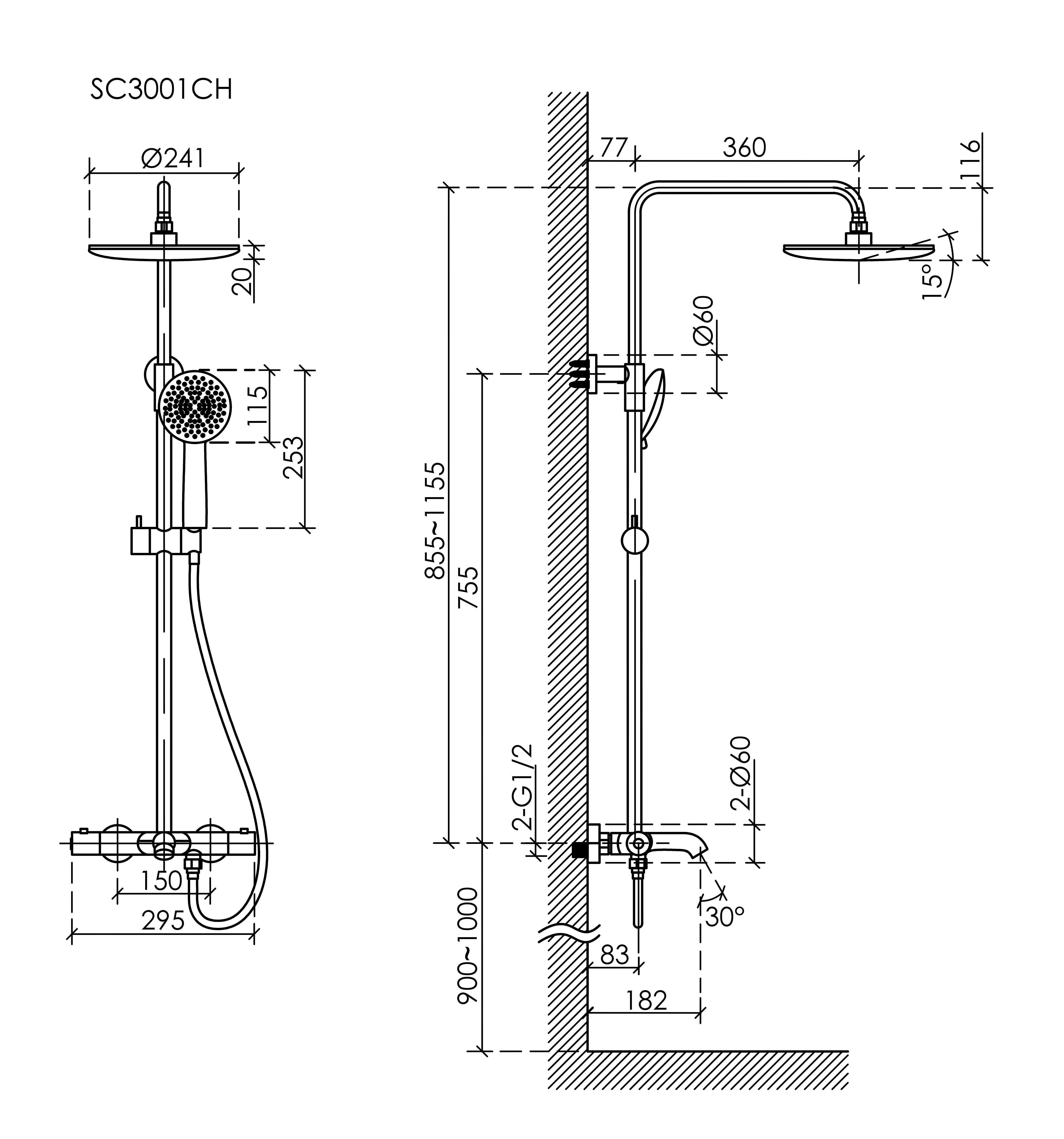 Оснащение: душевой шланг / душевая лейка / держатель для душа / переключатель потоков / эксцентрики
