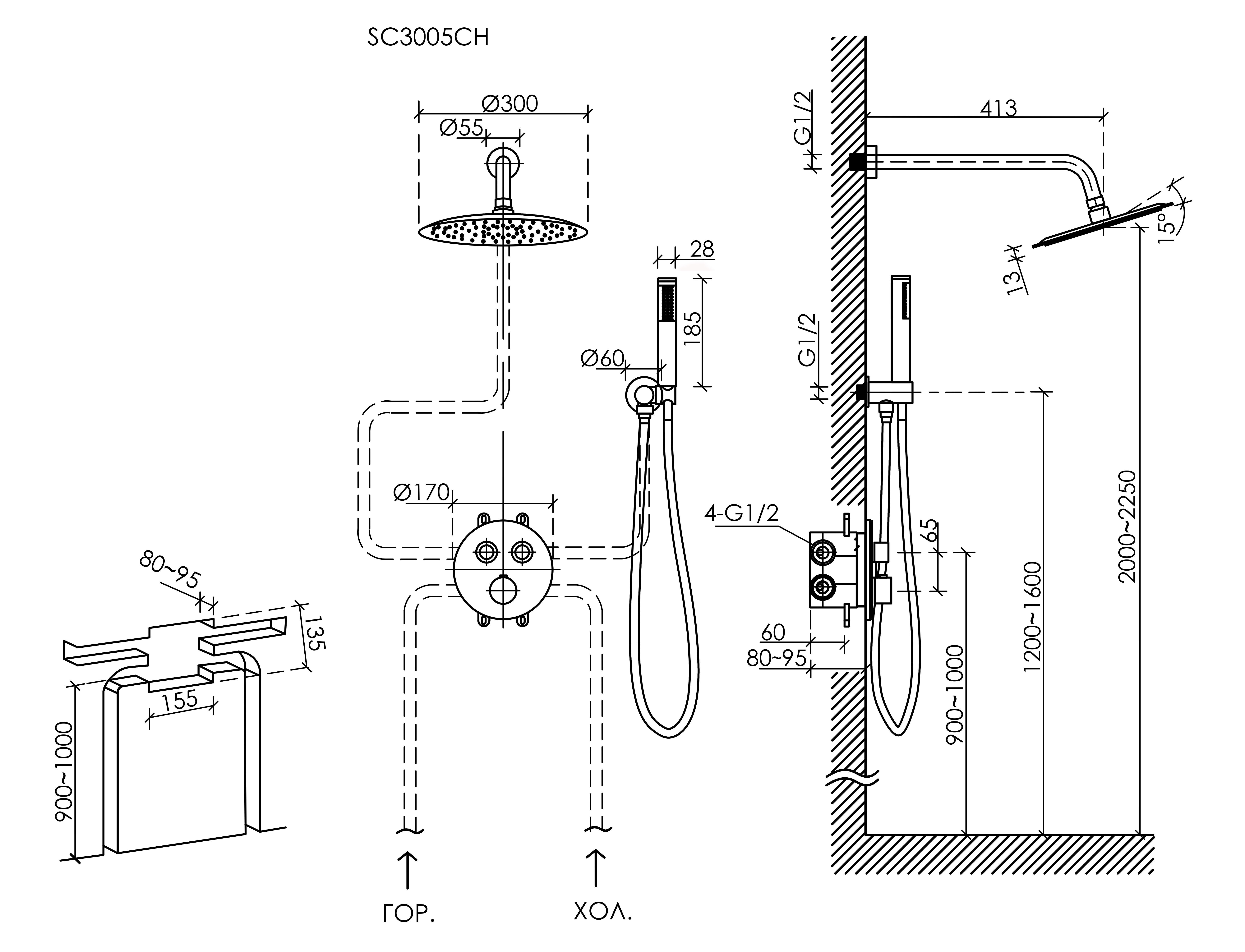 Оснащение: душевой шланг / душевая лейка / держатель для душа / переключатель потоков