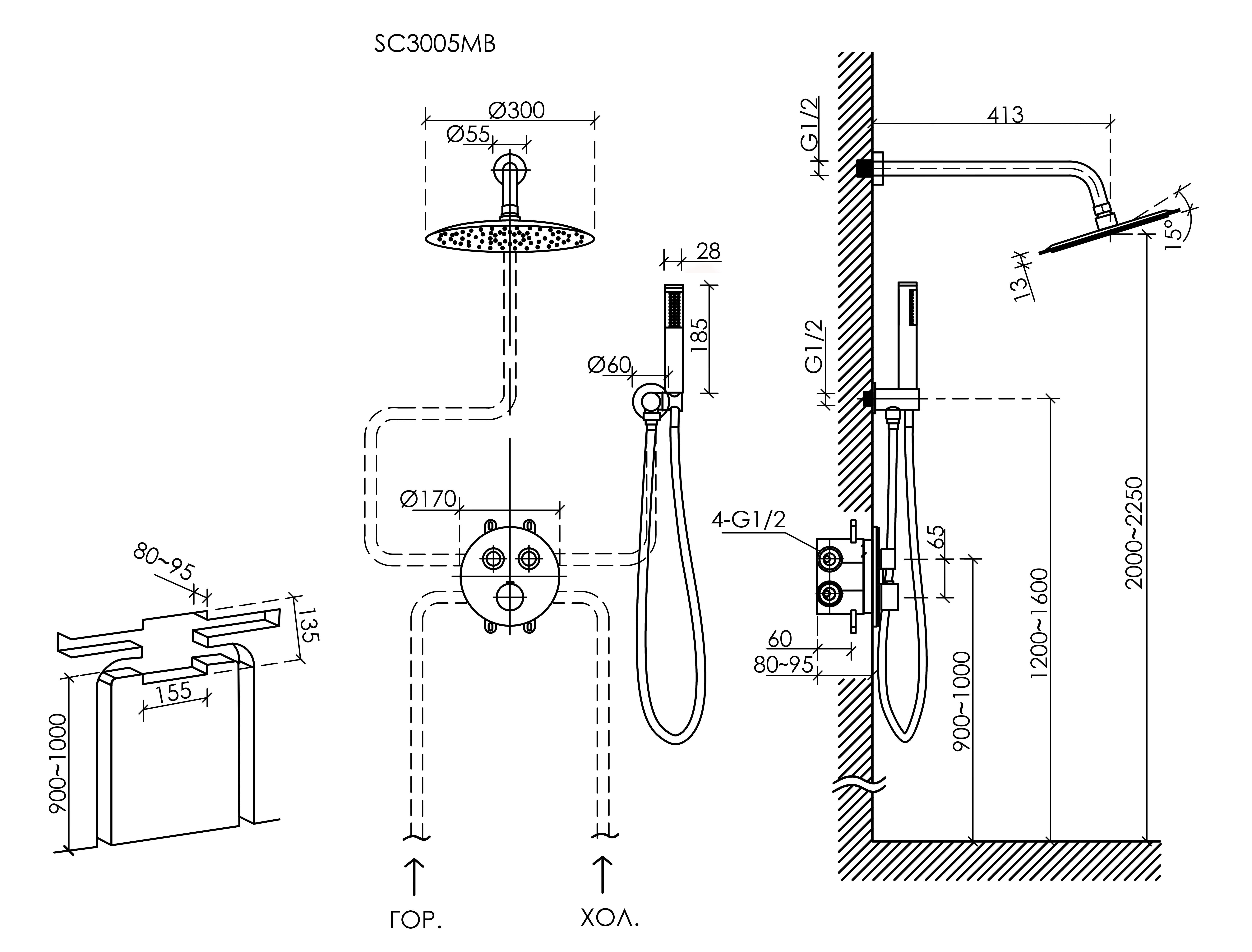 Оснащение: душевой шланг / душевая лейка / держатель для душа / переключатель потоков
