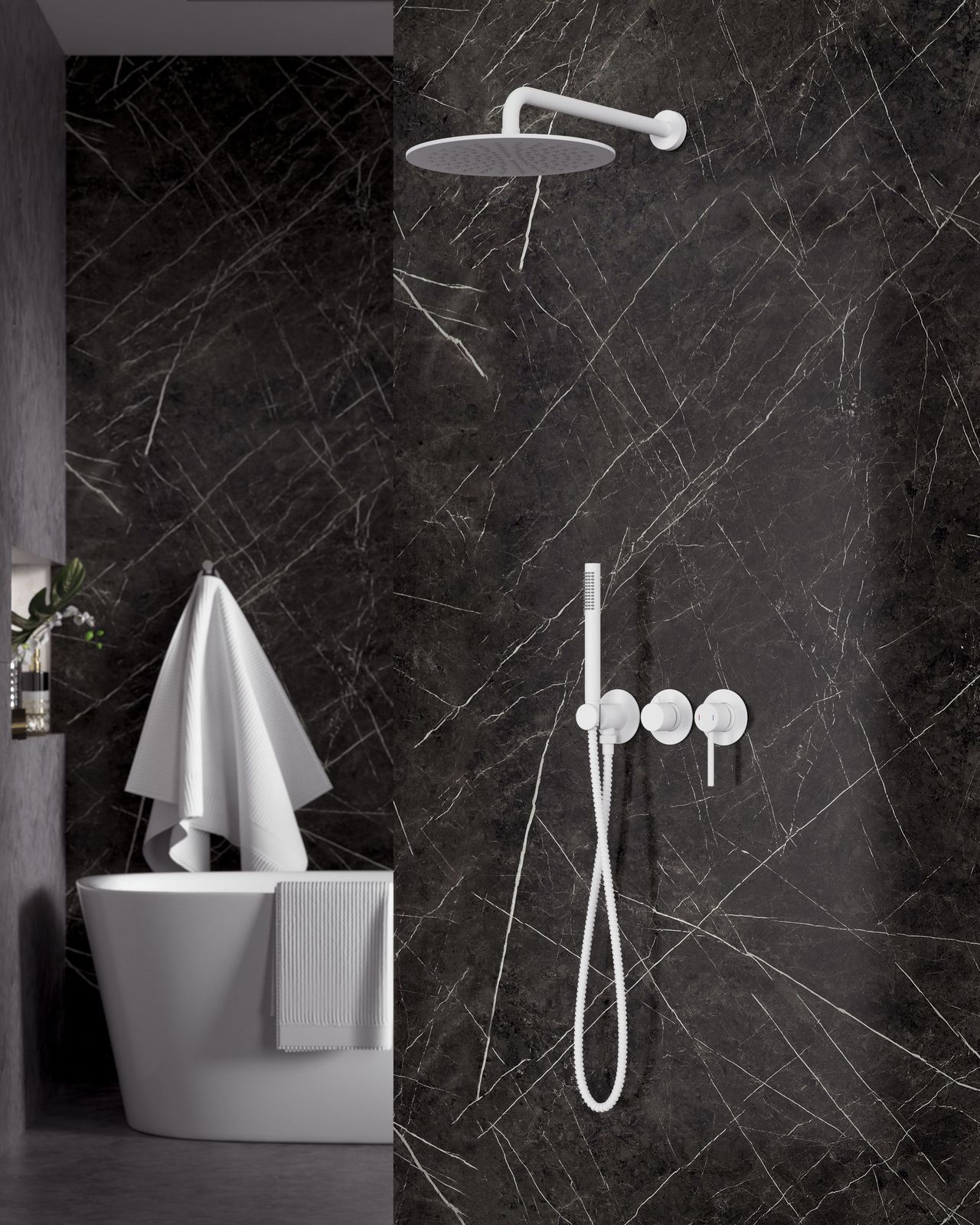 - Комплектация: смеситель, внутренняя часть, верхний душ, душевая лейка, шланг