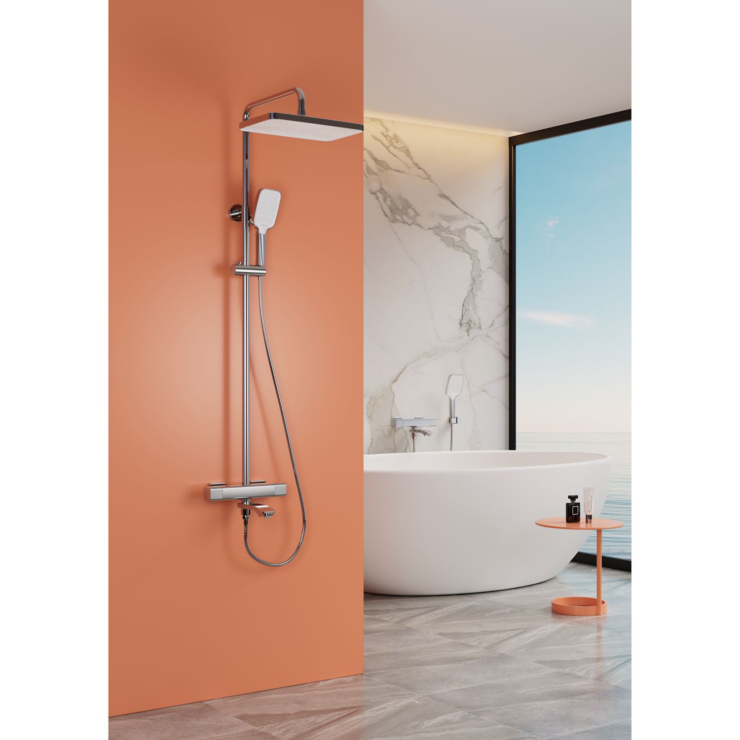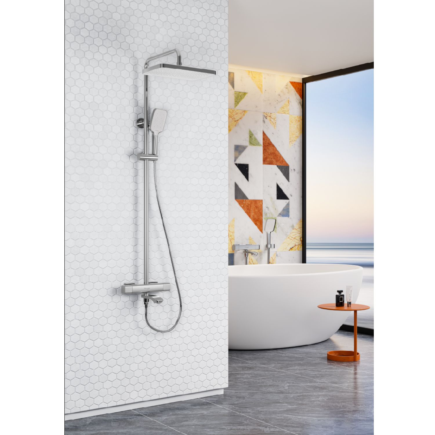 Верхний душ, душевая штанга с держателем лейки, ручной душ, смеситель, шланг |