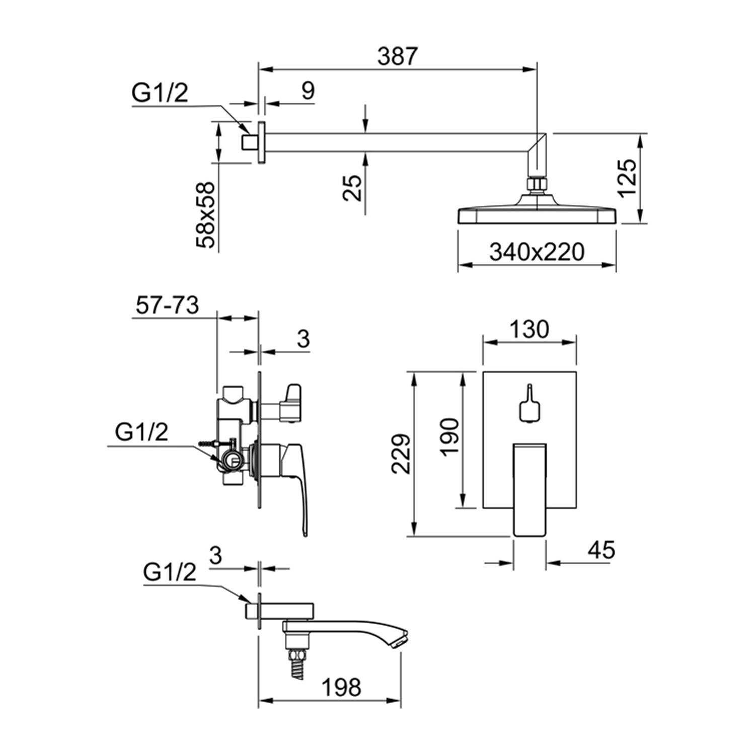 Смеситель, внутренняя часть, шланговое подключение с держателем лейки, душевой шланг, верхний душ с кронштейном, излив |