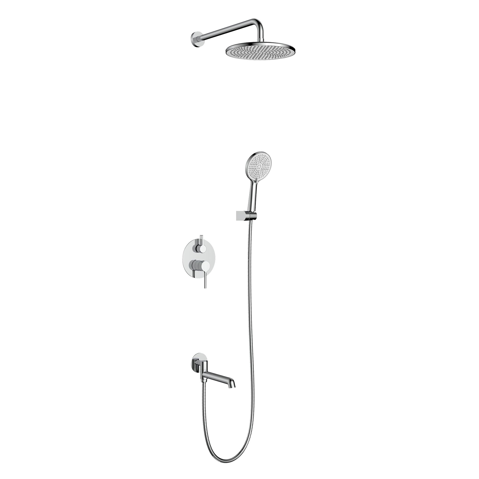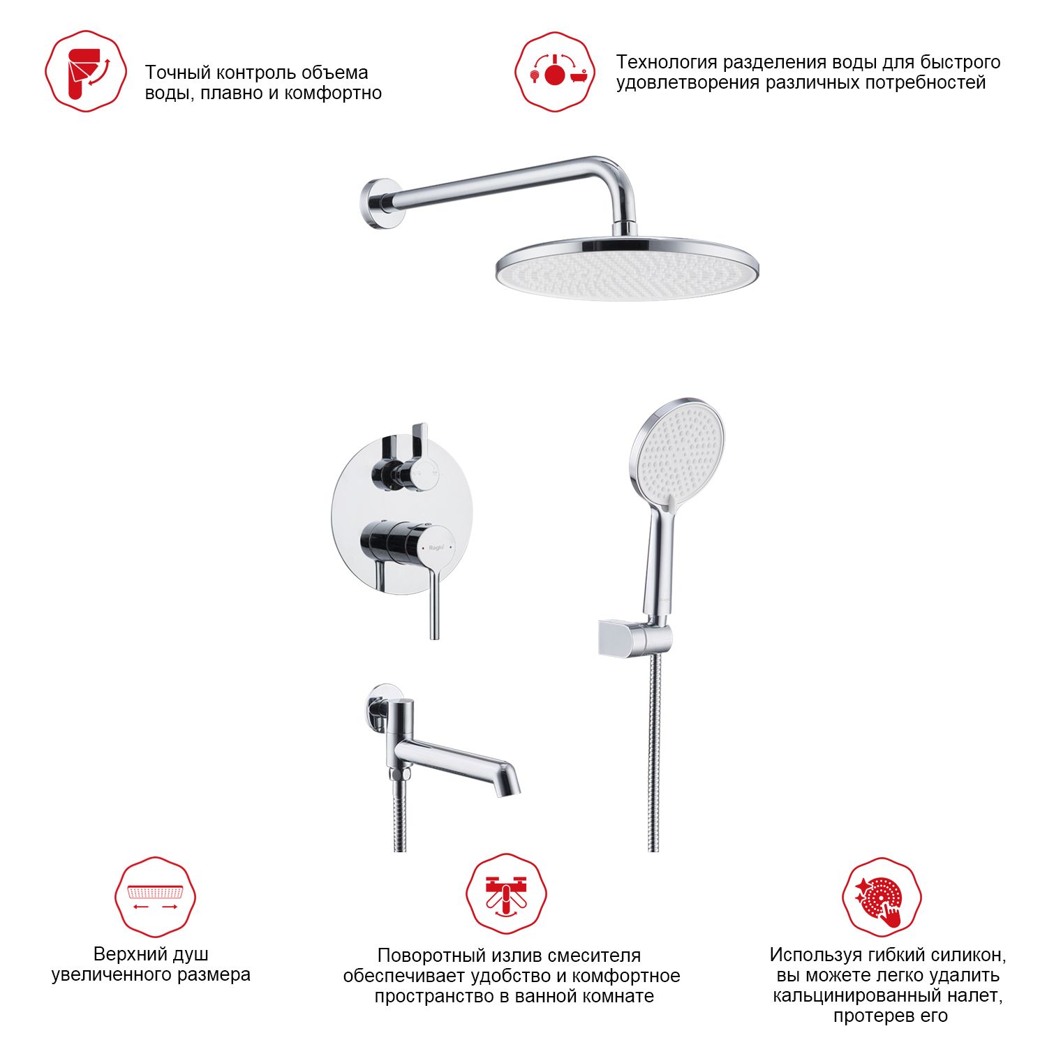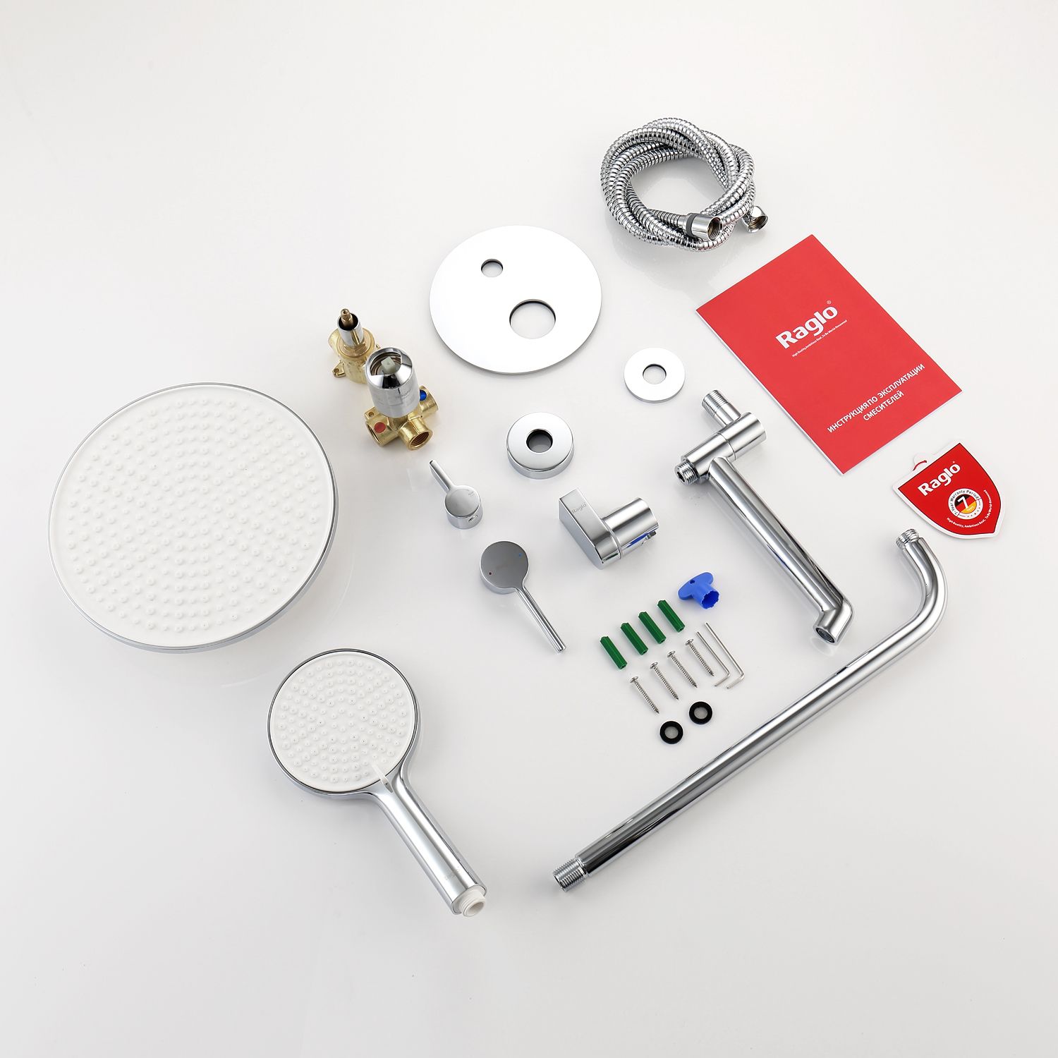Смеситель, внутренняя часть, шланговое подключение с держателем лейки, душевой шланг, верхний душ с кронштейном, излив |