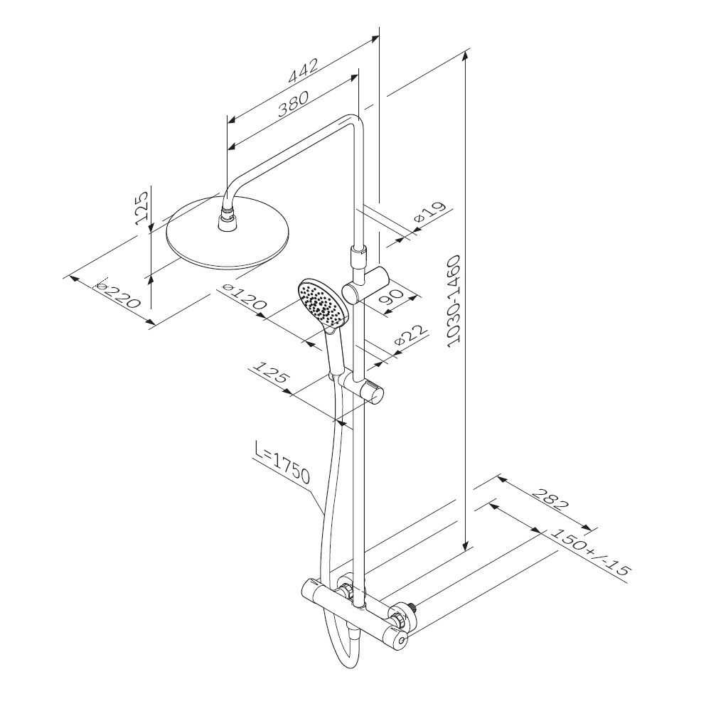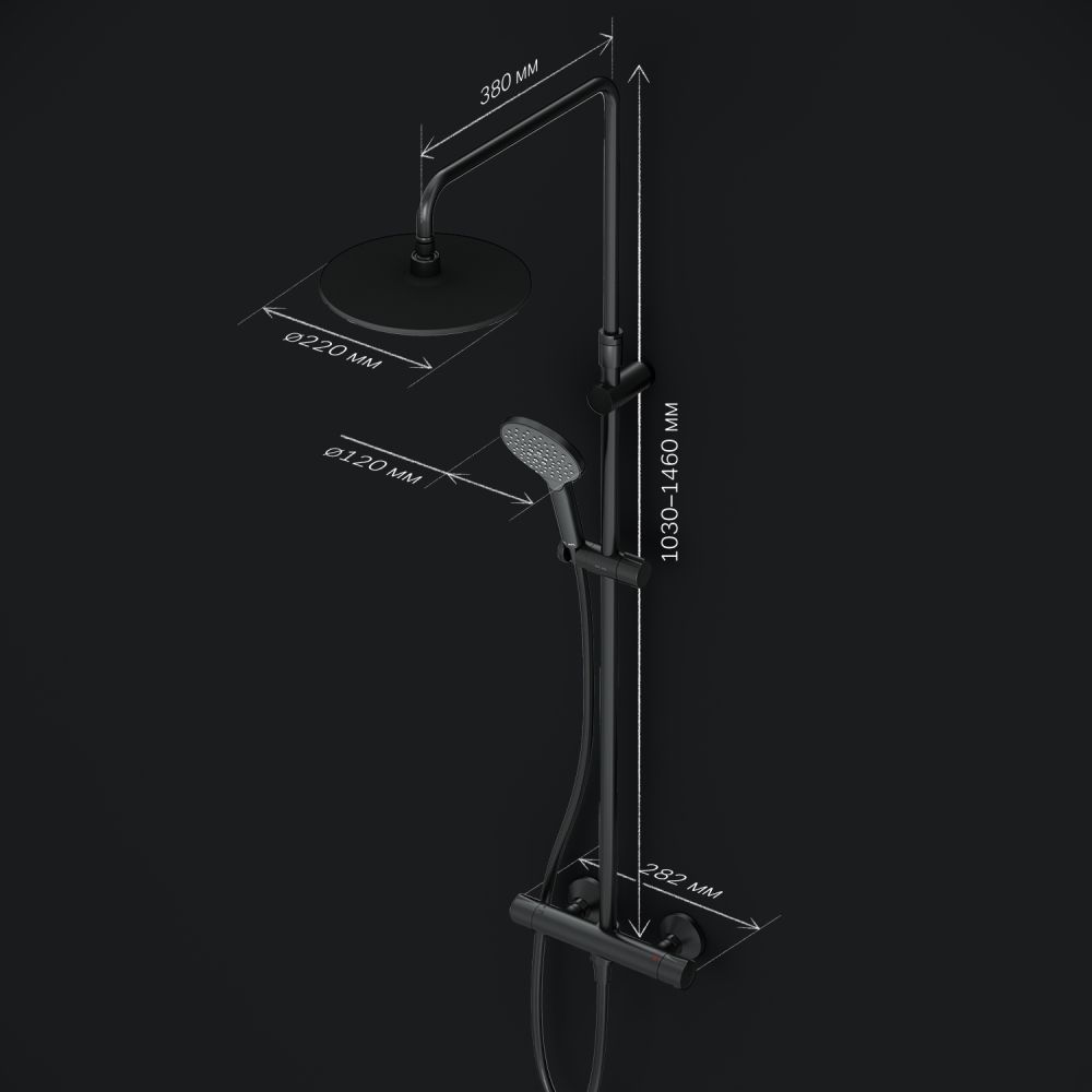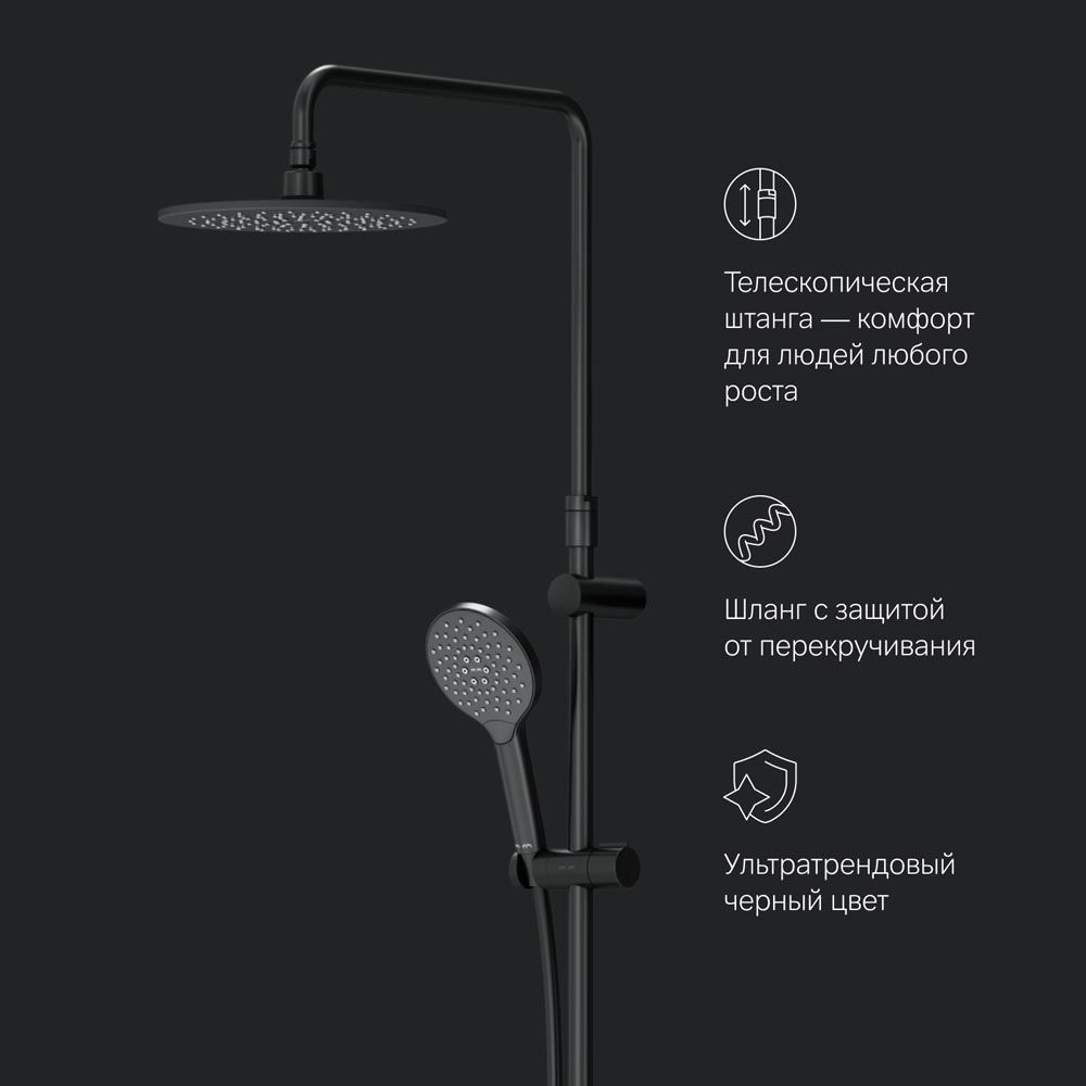 Продуманные детали для удобства использования: штанга регулируется по высоте в диапазоне от 1030 до 1460 мм обеспечивая комфорт для людей любого роста шаровый шарнир в держателе верхнего душа позволяет регулировать угол его наклона душевой шланг 1750 мм верхний душ диаметром 220 мм ручной душ диаметром 120 мм.