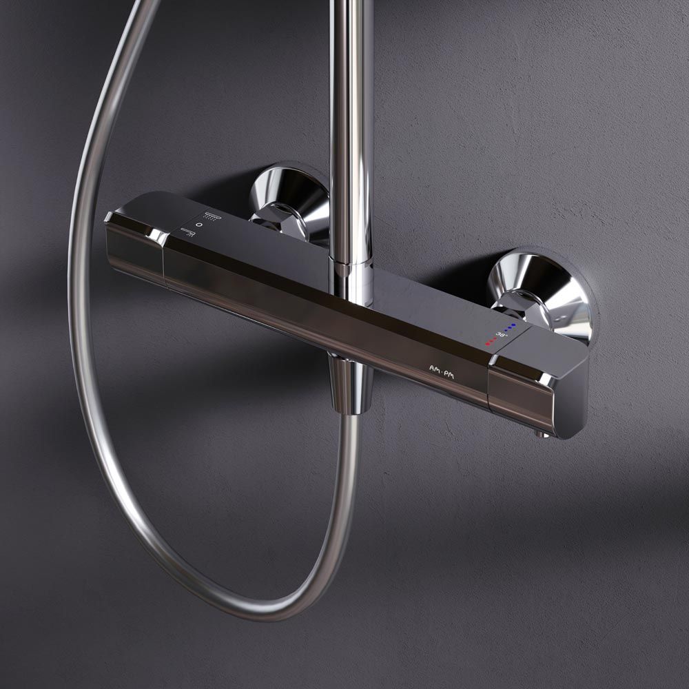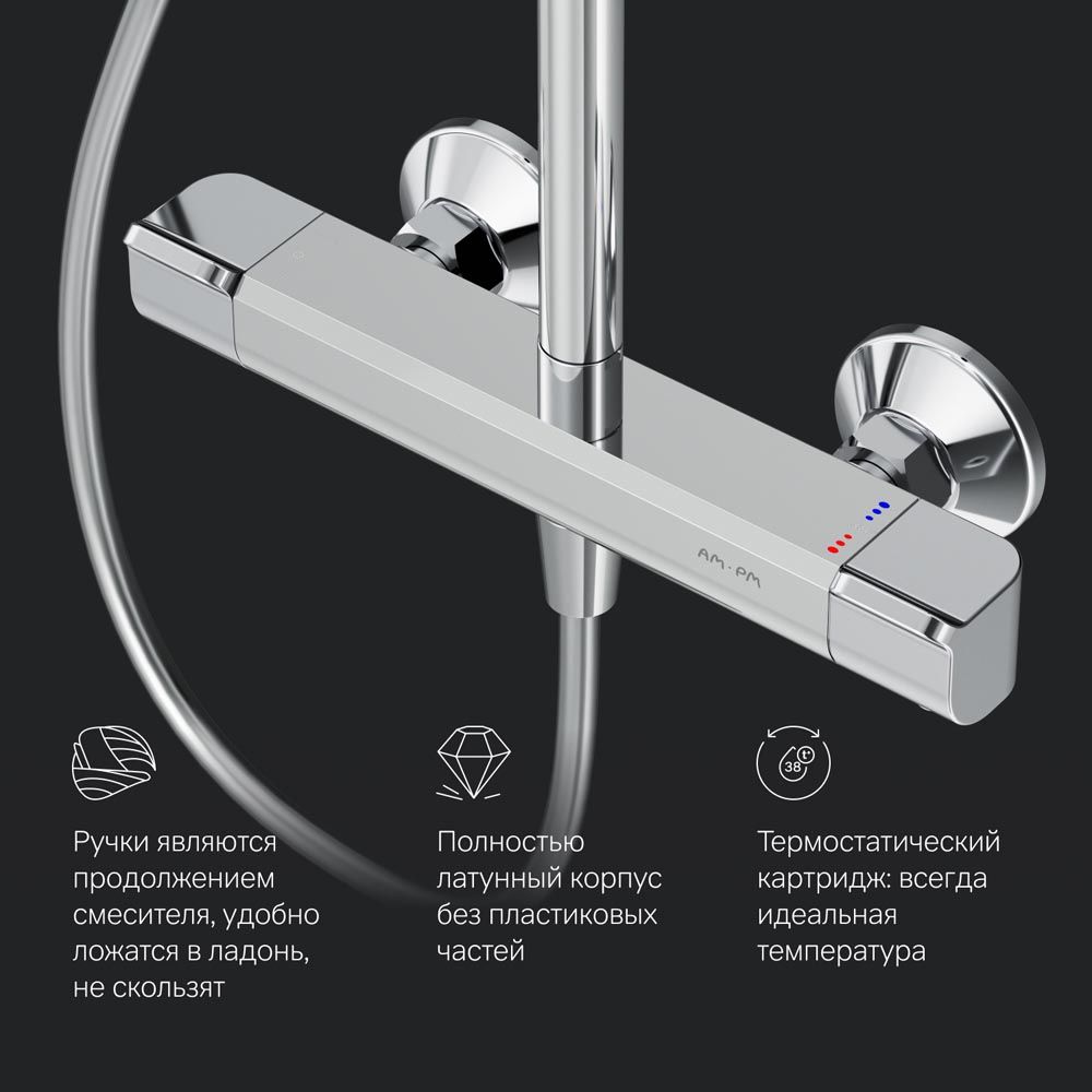 Смеситель для душа с термостатом: термостатический картридж с высокочувствительным термоэлементом и стопором безопасности на 38 градусах надежно защитит вас от ожога даже при внезапном отключении холодной воды.