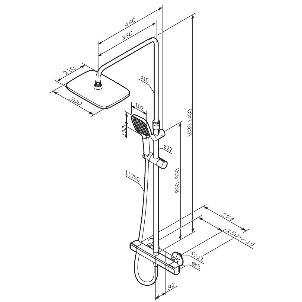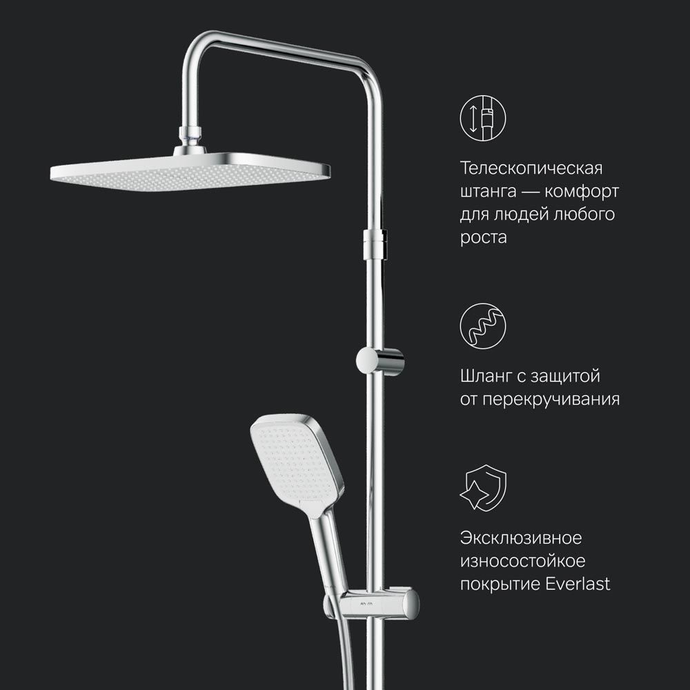 Продуманные детали для вашего удобства: телескопическая штанга регулируется по высоте обеспечивая комфорт для людей любого роста. Прямоугольная форма увеличенный размер леек и 3 режима ручного душа подарят вам ощущения настоящего домашнего SPA.
