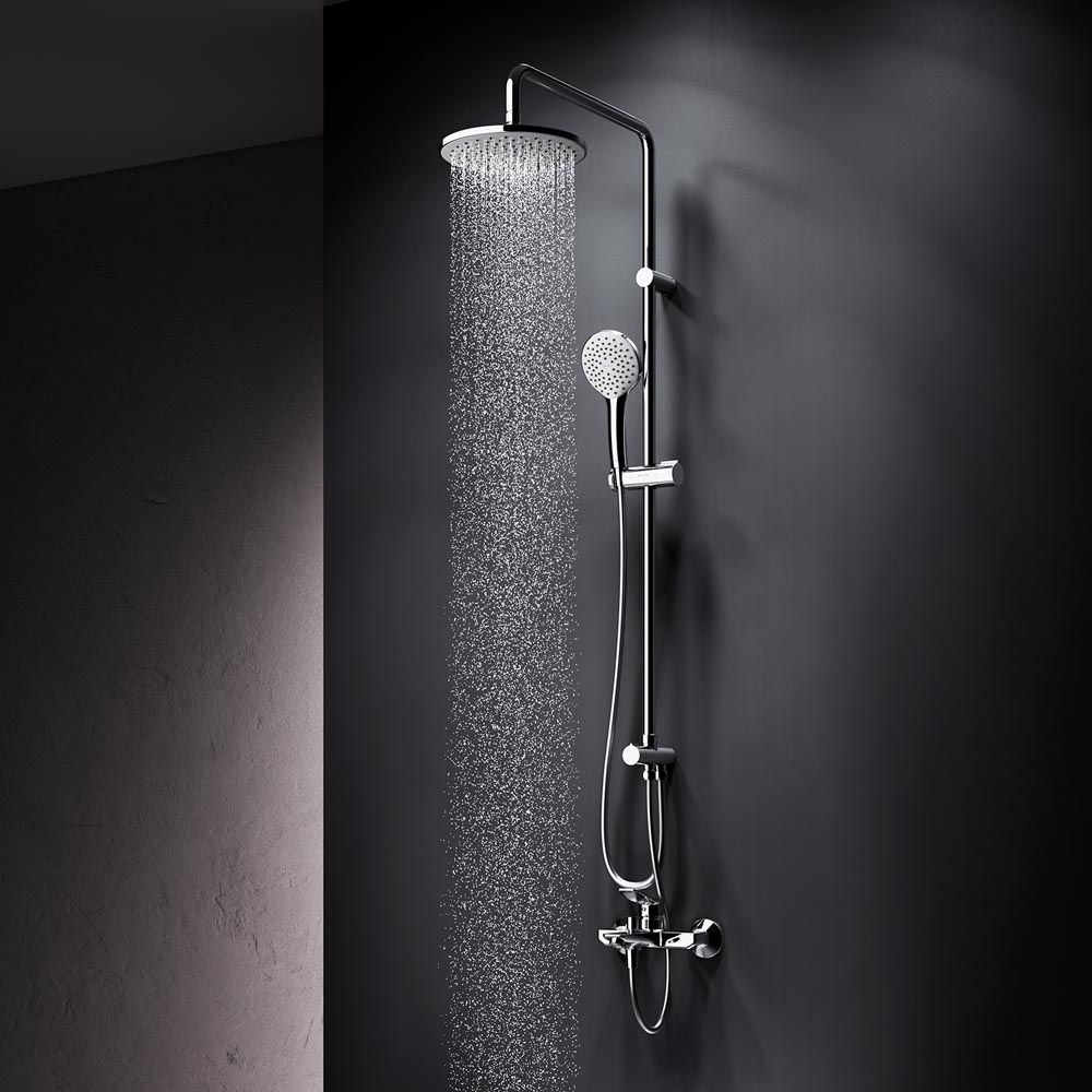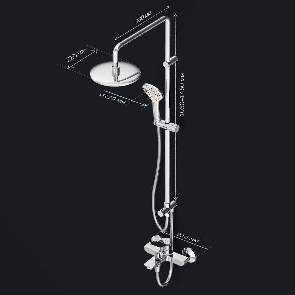 Продуманные детали душевой системы для удобства использования: штанга регулируется по высоте в диапазоне от 1 030 до 1 460 мм обеспечивая комфорт для людей любого роста шаровый шарнир в держателе верхнего душа позволяет регулировать угол его наклона душевой шланг 1750 мм верхний душ диаметром 220 мм ручной душ диаметром 110 мм. ""