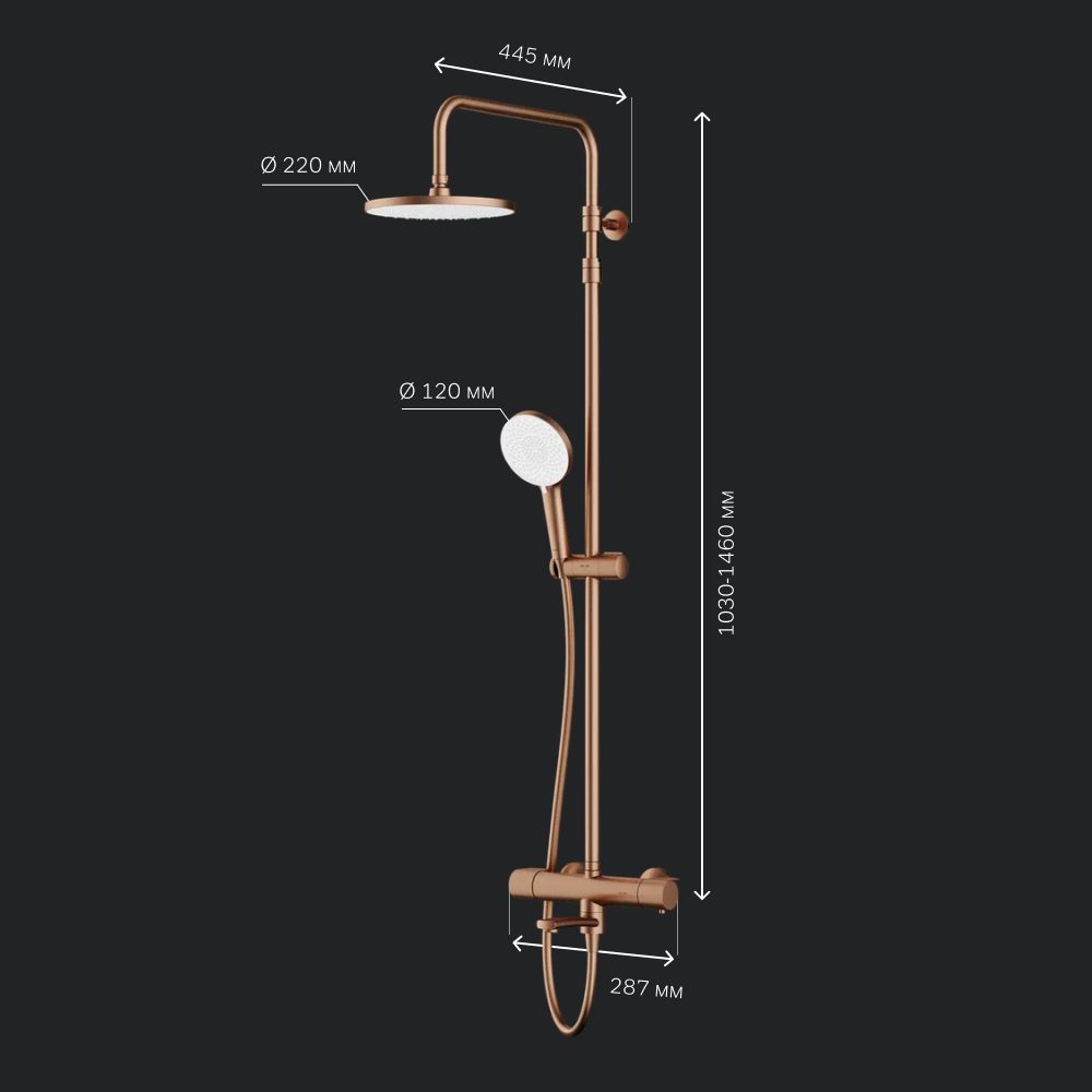 Телескопическая штанга с диапазоном регулировки 400 мм сделает процесс принятия душа удобным для людей любого роста. А благодаря увеличенным размерам тропического (220 мм) и ручного (120 мм) душей вы ощутите все преимущества использования дизайнерского продукта.