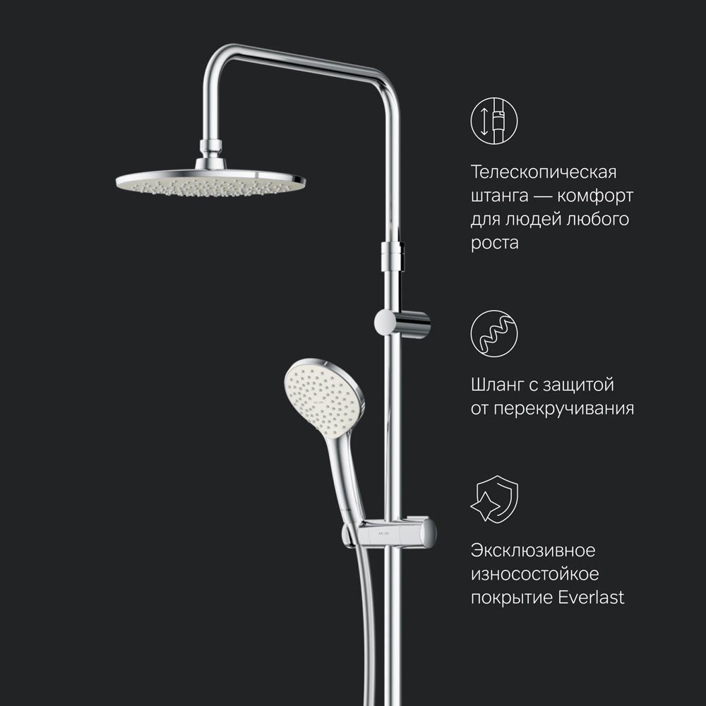 Диаметр душевых леек (верхний душ 220 мм и ручной душ 110 мм) позволит ощутить преимущества тропического душа даже в стандартной ванной тогда как увеличенная длина шланга 1750 мм обеспечит свободу движений во время принятия душа.