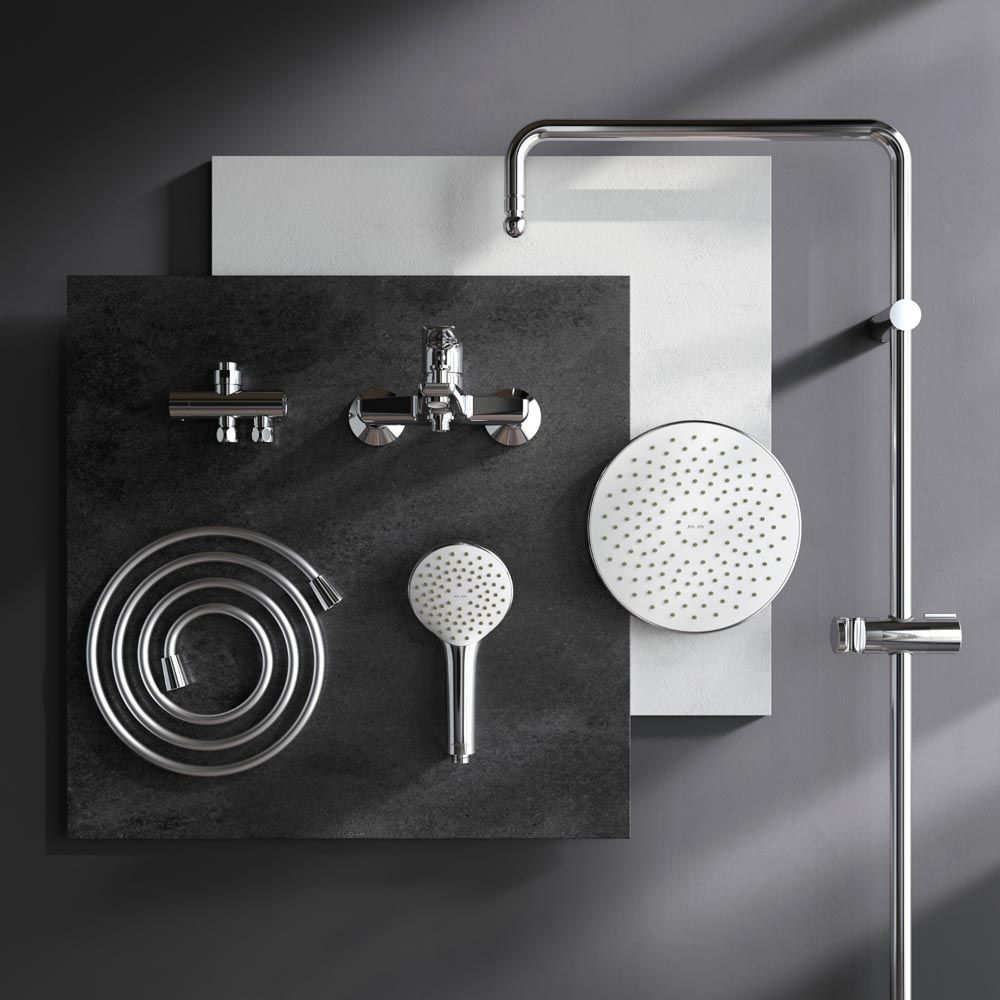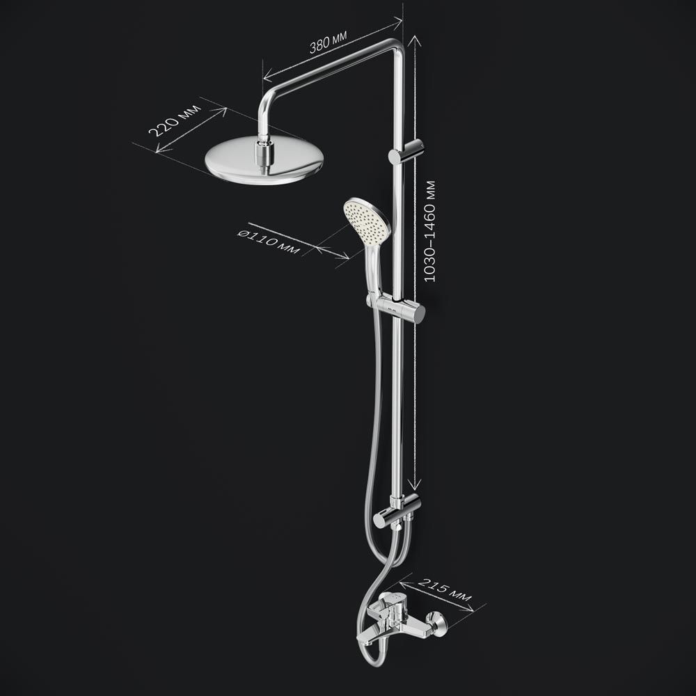 Диаметр душевых леек (верхний душ 220 мм и ручной душ 110 мм) позволит ощутить преимущества тропического душа даже в стандартной ванной тогда как увеличенная длина шланга 1750 мм обеспечит свободу движений во время принятия душа. Продуманные детали для удобства использования: телескопическая поворотная штанга регулируется по высоте в диапазоне от 1030 до 1460 мм обеспечивая комфорт для людей любого роста. ""