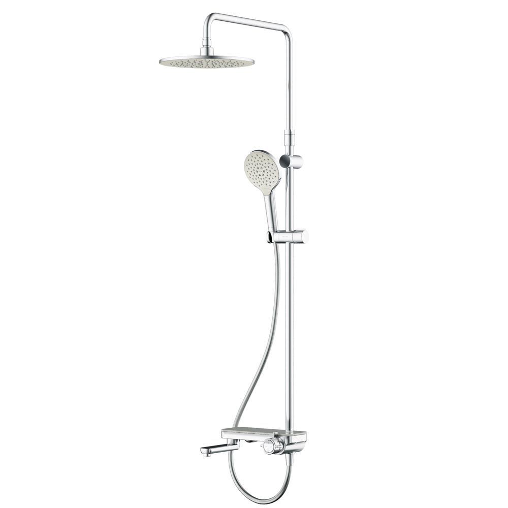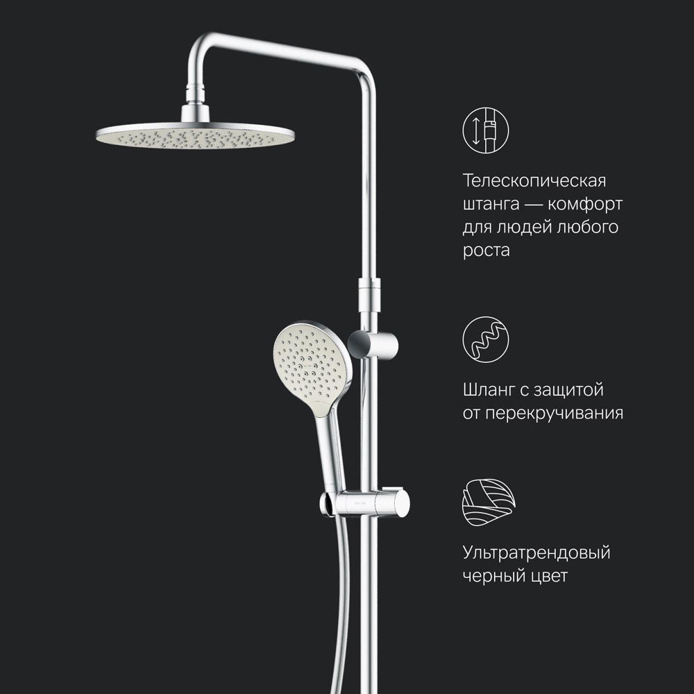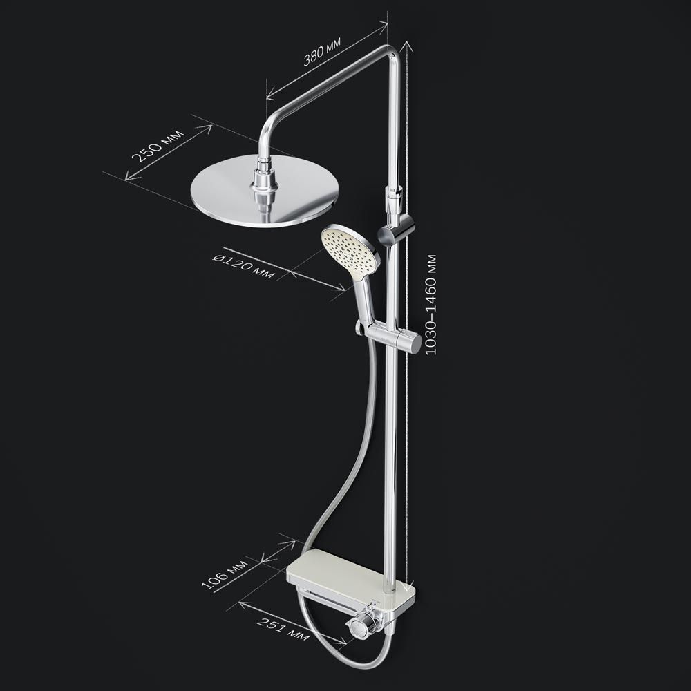 Премиальные размеры и продуманные детали: увеличенный диаметр душевых леек (верхний душ 250 мм и ручной душ 120 мм) позволит ощутить преимущества тропического душа тогда как увеличенная длина шланга 1750 мм обеспечит свободу движений во время принятия душа. Телескопическая поворотная штанга регулируется по высоте в диапазоне от 1030 до 1460 мм обеспечивая комфорт для людей любого роста а шаровой шарнир в держателе верхнего душа позволяет регулировать угол его наклона.