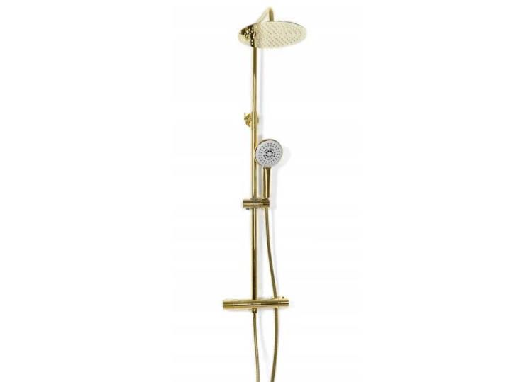 Свойства. Высота штанги: 83,5 - 123,5 см; Гарантия: 12 Месяцев; Длина Шланга: 150 см; Комплектация: Верхний душ, Держатель для душа, Душевая штанга, Кронштейн, Ручная лейка, Шланг для душа; Размер верхнего душа: 25 х 25 см; Страна-производитель товара: Польша; Термостат: Да; Цвет изделия: Золото.