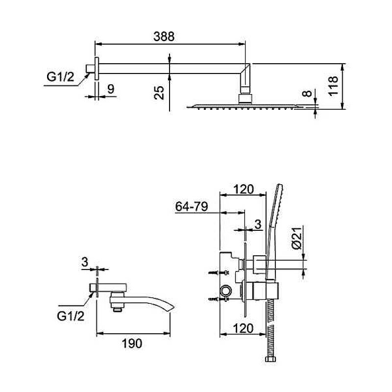 Устанавливается на стену, все крепления поставляются в комплекте. Подходит как для установки в душ так и для крупногабаритных ванн. Расположение элементов системы можно регулировать исходя из личных пожеланий.