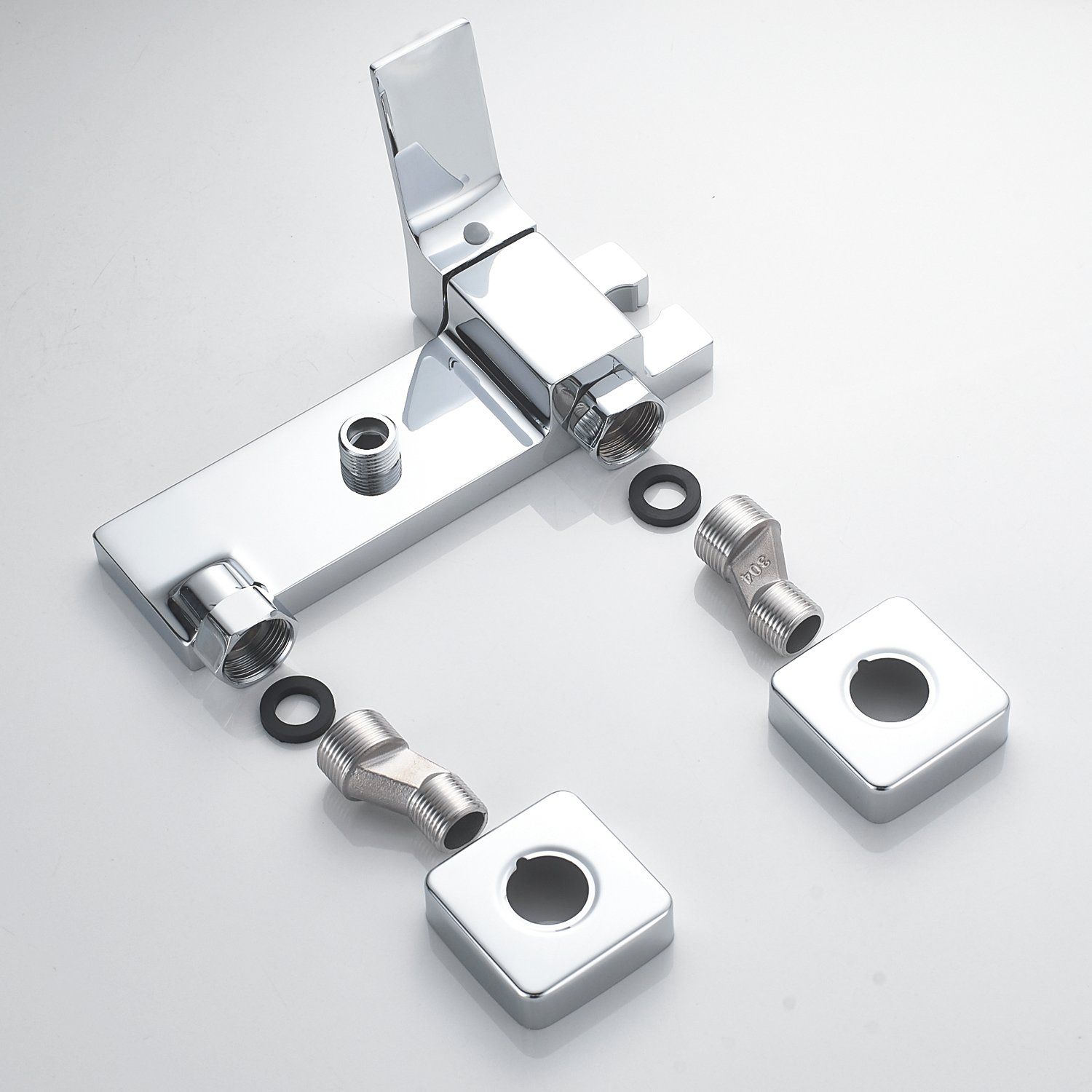 - Комплектация: смеситель, лейка, шланг, эксцентрики, декоративные чашки